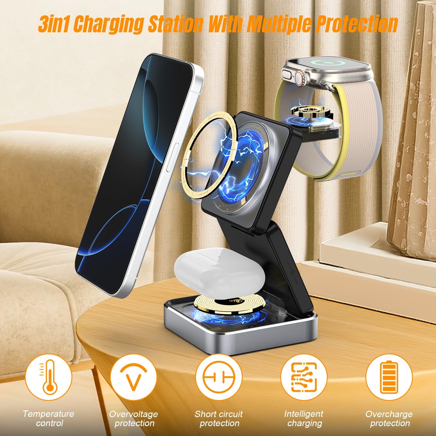 This 3-in-1 wireless charging station is a game-changer! It neatly powers my iPhone, Apple Watch, and AirPods simultaneously without any cable clutter. The fast charging works brilliantly, saving me so much time. The foldable design makes it perfect for travel, and the sleek cube keeps my desk organized. Highly recommend for anyone with multiple Apple devices—efficient, compact, and totally worth it!