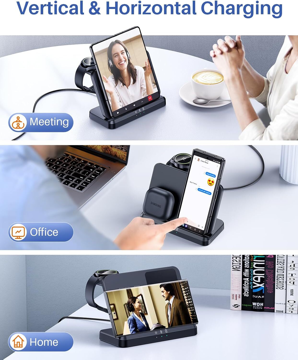 3 IN 1 Samsung Charging Station: The LK wireless charger is greatly for Galaxy Watch Ultra/7/6/6 Classic/5 Pro/5/4/3/Active2/1, Samsung Galaxy S24 Ulta/S24 Plus/S24 S23 S22 S21 S20/Ultra/Plus/FE, Z Flip 6/5/Z Fold 6/5/4/3/2, S10/S10e/S10+/S9/S9+, Galaxy Note20/10/9/8, Galaxy Buds3/Pro/Live. (NOTE: Earbuds require a wireless charging case. Not for Galaxy Buds FE). It also supports other smartphones with wireless charging capabilities. Foldable and Carry-Friendly: The NEW LK charging station for Samsung is foldable and detachable, making it light. Perfect to carry in your bag or suitcase. It's an all-in-one charging station for Samsung, ideal for home, office, travel, and on-the-go use. Plus, it functions as an adjustable phone stand for added versatility. Case-Friendly: Our wireless charging stand supports phone cases with a thickness ≤ 0.2 inches (5mm). The metal case, magnetic pad, credit card, grips&stands will interfere with charging. PLEASE AVOID using cases with metal rings, pockets, magnets Friendly LED Indicator: The LED indicator light turns on for 3 seconds when powered, stays lit during charging, and blinks to indicate foreign object detection (unable to charge). The wireless charger for Samsung comes with non-slip silicone pads to prevent device slippage Safe Charging for Samsung Devices: Featuring a dual-coil design, this phone and watch charging station for samsung offers a broad charging area for both horizontal and vertical charging. It includes overcurrent, overvoltage, overheating protection, and detects foreign objects. Internal circuitry prevents overcharging for extended battery health, making it a versatile multiple devices charger. Package: You will get 1 x LK 3 in 1 charging station, 1 x QC3.0 18W Adapter, 1 x USB A-C Cable, 1 x User Manual and reliable 24-hour response service. 24 Months LK's distinguished customer service. if you got any problems about the wireless charger.