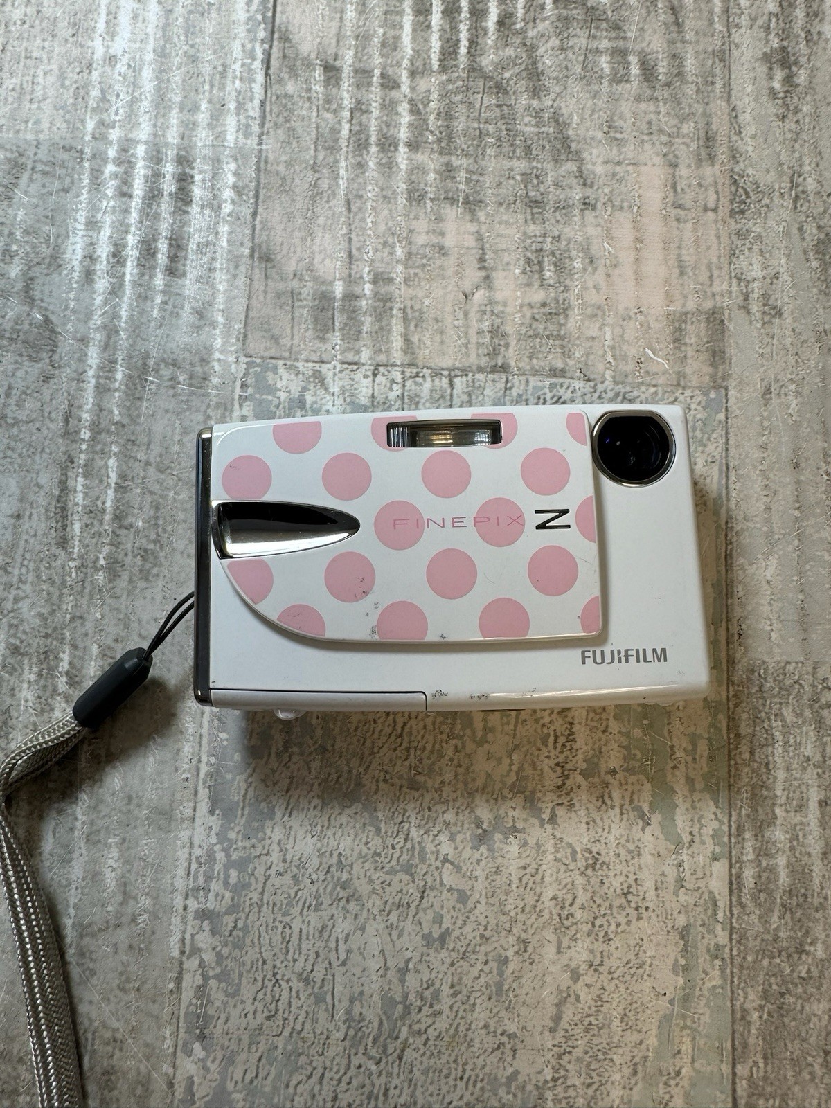The Fuji Finepix Z20 Camera in White with Pink Polka Dots is a rare and tested digital camera that offers a maximum resolution of 10.0 MP. With a 3x optical zoom and digital zoom, this camera allows for versatile shooting capabilities. The compact design, 2.5-inch screen, and lithium-ion battery make it convenient for capturing memories on the go. The built-in flash, auto focus, and audio recording features further enhance the functionality of this Fujifilm camera, making it a stylish and reliable choice for photography enthusiasts.