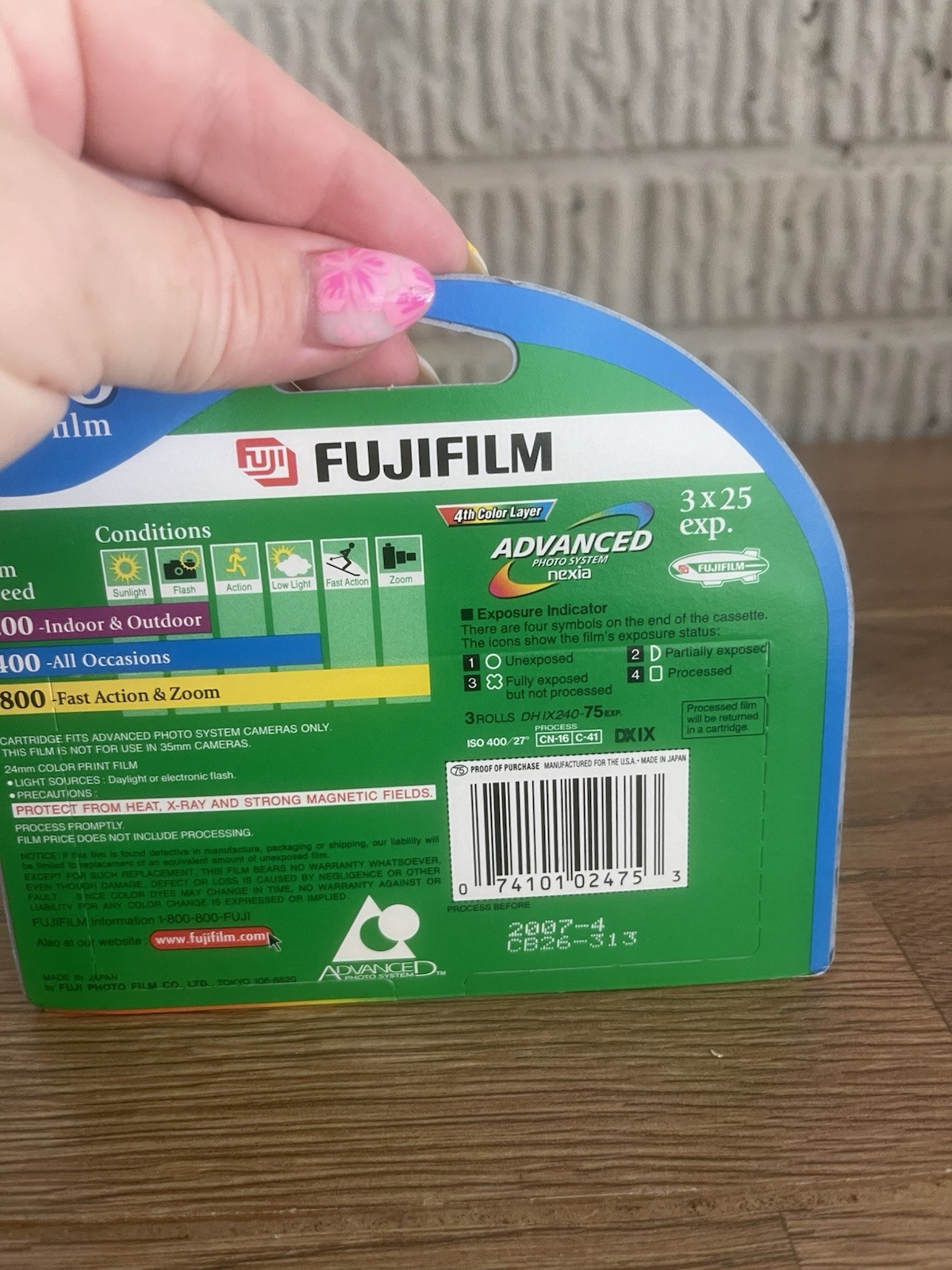 The product is a set of three sealed rolls of Fujifilm 400 speed advanced color film in 24mm format. Each roll contains 25 feet of film, with an expiration date of 2007. This film is ideal for film photography enthusiasts looking for high-quality images with a color film speed of 400 ISO. The Fujifilm brand ensures reliability and excellent results, making it a popular choice among photographers.