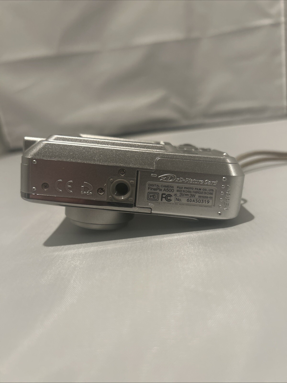 This is the Fujifilm FinePix A Series A500 digital camera in silver, featuring a 5.1 MP maximum resolution, 3x optical zoom, and 5x digital zoom. It includes features like direct print, date/time stamp, DPOF support, and PictBridge support. The camera uses AA batteries and weighs 8 oz.