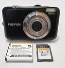 The Fujifilm FinePix JV100 is a compact digital camera from the JV Series with a 12.2MP maximum resolution. It features a 3x optical zoom and 6x digital zoom, allowing for versatile shooting options. With technologies such as face detection, blink detection, and direct print, this camera offers convenience and ease of use for capturing high-quality images. The sleek black design, lightweight construction, and included accessories like a case, battery, and charger make it a practical choice for photography enthusiasts looking for a reliable and user-friendly camera. THERE'S A SCRATCH ON THE SCREEN (SEE PHOTO'S). THERE'S A MARK ON THE LENS (SEE PHOTO'S) THIS DOESN'T APPEAR TO AFFECT THE IMAGE (SEE PHOTO'S).