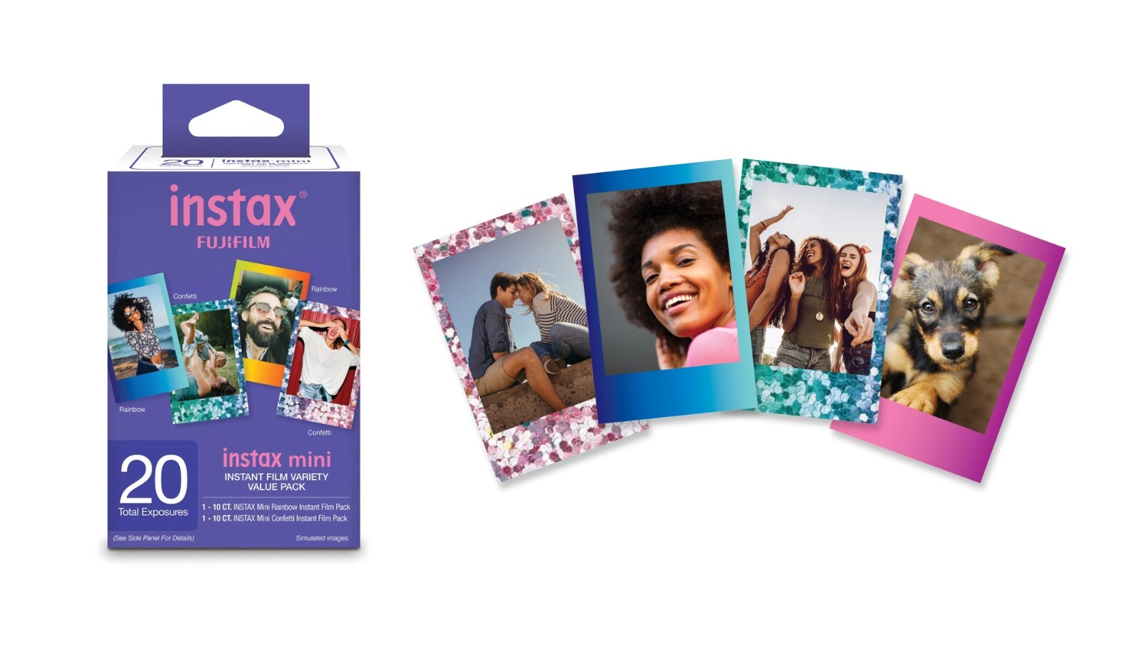 About this item Fujifilm Instax Mini Film - Variety Pack, Instant Camera Film, 40 exposures, 5.4cm x 8.6cm (film size) Box includes a 40 pack with a variety of film designs Includes: 10 while border; 10 rainbow border; 10 pink lemonade border; 10 monochrome border Total of 40 shots inside each box With one purchase, you are able to have a variety of designs available Compatible with all Fujifilm instax mini Cameras and Printers Each print measures 5.4cm x 8.6cm