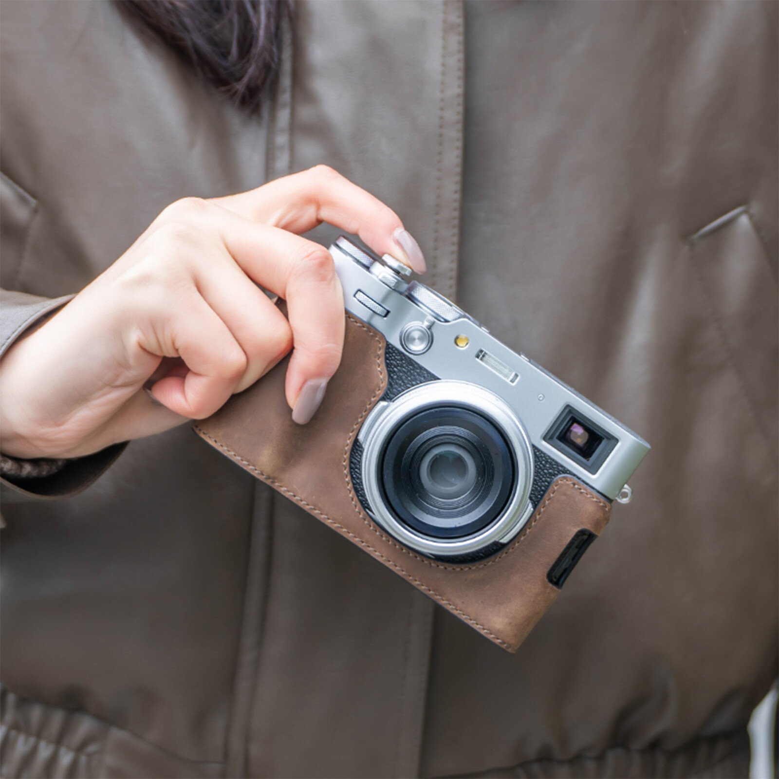 Leather case kit for FUJIFILM X100VI 4558 is designed to protect the camera, lens, and enhance the retro feel, and quality of the camera. The kit includes a Leather Half Case, a flip case cover, and a shoulder strap. Both the external of the leather half case and flip case cover are made of breathable and wear-resistant first layer cowhide and repeat the silhouette of the camera to create an eye-catching style; the internal is made of Soft microfiber to provide All-around protection for the camera and lens. It perfectly fits the camera body and allows access to camera interfaces and buttons: battery compartment, MSC mode, card slot, etc.; The case is built-in aircraft-grade aluminum alloy for support to protect the camera from impacts. the bottom 1/4"-20 thread allows the case to be mounted onto the tripod directly without removing the case; The flip case cover features magnetic clasp and Velcro for more convenient and safety; It comes with a PU shoulder strap, easy to carry and hang camera. Designer: Kong, Yette White Note:The case may have some color differences because of using genuine leather. Compatibility FUJIFILM X100VI In the Box: 1 x Leather Half Case Specifications Product Dimensions: 135 x 75 x 95 mm / 53.1 x 2.0 x 37.4in Package Dimensions: 165 x 158 x25mm / 65.0 x 62.2 x 9.8in Product Weight: 262±5g / 9.2±0.2oz Package Weight: 365±5g / 12.9±0.2oz Material(s): Leather, PU, Aluminum Alloy