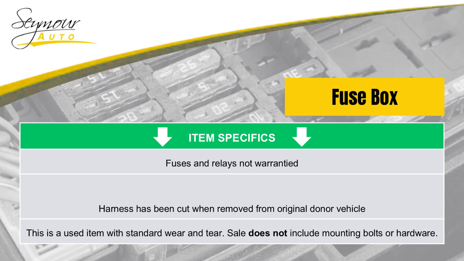 Welcome to our eBay Store! Fuse Box Engine Without Extended Range Keyless Remote Fits 11-14 CRUZE 578720 Description ******* SAME DAY SHIPPING ******** Donor Vehicle VIN: 1G1PE5SB2D7176985 Model: CRUZE Year: 2013 Mileage: 158000 (0 = not available or unknown) Stock Number: 221333 Store Number: 1 Part Detail Part Grade: A Part Category: U Part Placement: Notes: This part will fit these makes and models with these options CRUZE 11 1.4L, AT CRUZE 12-14 AT, w/o extended range keyless remote WARRANTY / GUARANTEE Most parts we sell through eBay Motors come with a 30 day money back guarantee unless otherwise stated. The 30 day period starts when you take possession of the part. No labor warranty is provided. In the event a part sold with a warranty fails to operate within the warranty period we will replace the part(s) with a functionally equivalent part or refund the part purchase price, at our option. No refund on deposits or unwanted special order parts or special "cut" items. To return an item you must contact us via eBay Message within the 30 day period to obtain a RMA number (return material authorization). Original shipping charges and return shipping charges are not refunded. Once you obtain an RMA number, ship the item back to Seymour Auto Wrecking 107 New Haven Rd Seymour, CT 06483 along with the RMA number. SHIPPING NOTES ABOUT US HELP Seymour Auto Wrecking ships to US addresses within the 48 states only via UPS ground. No Alaska, Hawaii, Puerto Rico, APO, FPO or PO Box's at this time please. No International shipping is available at this time. Pick up at our facilities is available. Please email us prior to your purchase to arrange pick up. Items will be shipped within 1-2 days of purchase. Please allow 5-10 days for delivery. Most areas in the US are within 5 days. No expedited shipping is available. If an item arrives damaged, please contact us via eBay Message within 24 hours for instructions. If you have a question about a part please contact us BEFORE purchasing. Our main contact method is by eBay Messages. We try to answer all messages within 24 hours. If we are unable to answer your questions before the listing ends the item will be re-listed again soon for you to purchase.