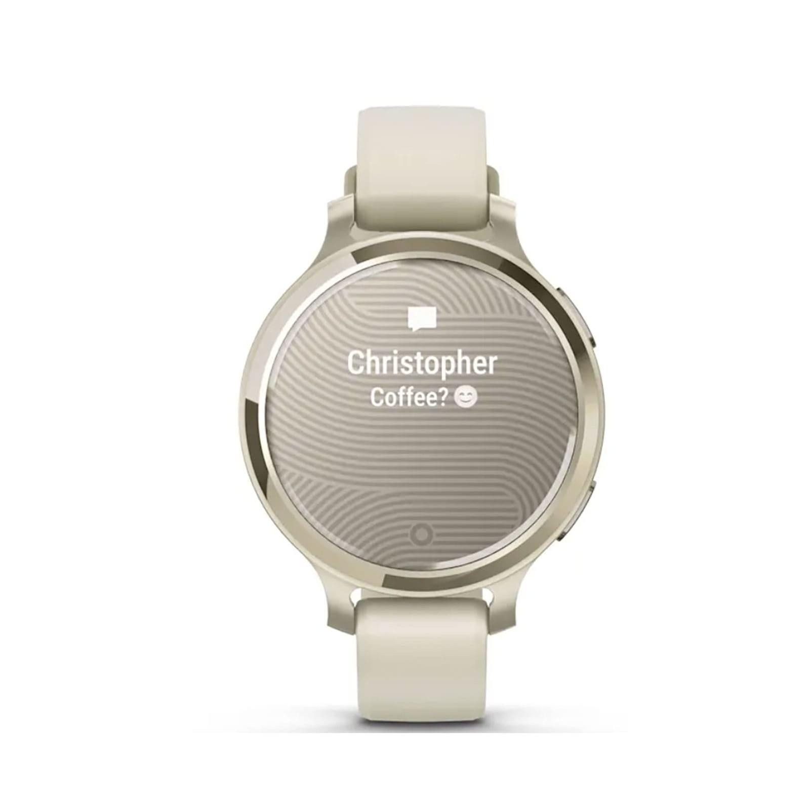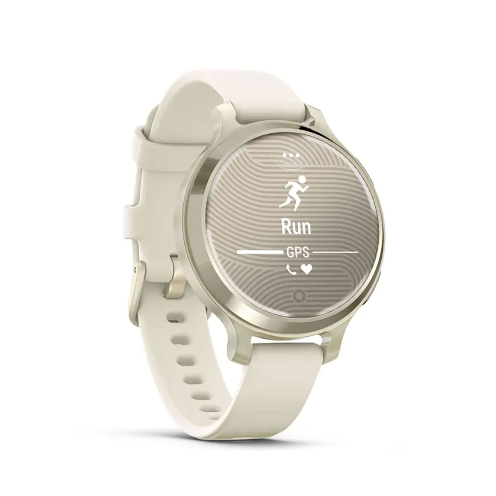 GARMIN Lily 2 Gold with Bone Silicone Band Active Smartwatch (010-02891-00) FEATURES Small, stylish smartwatch complements your look with a unique patterned lens that, with a tap, reveals a bright touchscreen display Designed with a metal watch case, two buttons and a variety of silicone band colors, so you can find the perfect piece to fit your look Stay fashion-forward 24/7, and get a more complete picture of your health with up to 9 days of battery life Built-in GPS tracks many outdoor activities; plus, get sports apps for yoga, Pilates, cardio, dance fitness, golf and more Stay connected with smart notifications when paired to your smartphone for incoming calls, text messages, calendar reminders and more See how active you are throughout the day with step counting, calories burned, intensity minutes and more (data presented is intended to be a close estimation of metrics tracked) Train for your next 5K, 10K or half-marathon with Garmin Coach training plans from expert coaches Get your sweat on with easy-to-follow on-screen workouts for strength, HIIT, yoga and more Leave your cash and cards at home; Garmin Pay contactless payments let you pay for purchases on the go (with a supported country and payment network) Description Hidden display, patterned lens - just tap to reveal a bright display. Featuring a hidden display and patterned lens plus essential Health and Fitness features, the GARMIN Lily 2 Active Smartwatch is more than meets the eye. It's the small, stylish smartwatch with Built-In GPS designed to help you look and feel good - inside and out. Sophisticated & Sporty Built-In GPS to track outdoor activities, including walks, runs and more. Trendy & Timeless Get a more complete picture of your Health with up to 9 days of battery life. Haute & Healthy Heart Rate, Sleep Score, Body Battery Energy Monitoring and Women's Health. Classic & Connected Get Smart Notifications for texts, calls and more when paired with your iPhone or Android smartphone. Small, Stylish Design Perfect for any look, this smartwatch features a metal watch case, two buttons and a beautiful patterned lens. Plus, with a quick tap or wrist turn, the Lily 2 Active smartwatch reveals a bright display. You can even mix and match cases and bands to make Lily all your own. Built-In GPS No matter where your workout takes you, accurately track your outdoor activities, including walks, runs and more - without compromising style. Body Battery Energy Monitoring See your energy levels throughout the day so you'll know when your body is charged up and ready for activity or drained and needing to recharge with restful sleep. Sleep Score Get a score for your sleep's quality and insights on how you can do better. Even keep track of the different sleep stages as well as heart rate, stress, Pulse Ox and Respiration. Fitness Tracking and Sports Apps While you're out and about, Lily 2 Active tracks steps, calories burned, Intensity Minutes and more. Switch up your workout with even more built-in sports apps for cardio, yoga, tennis, golf, dance Fitness, strength training and more. Garmin Pay Contactless Payments Breeze through checkout lines and select transit systems with Garmin Pay contactless payment solution through participating providers. Wrist-Based Heart Rate This feature constantly samples your heart rate and can be set to alert you if it gets outside the range you select. HRV Status Gain a deeper understanding of your overall Health through heart rate variability while you sleep. Morning Report Receive and customize an overview of your sleep, daily calendar, weather and more as soon as you wake up. Women's Health Tracking Track your menstrual cycle and pregnancy, and get exercise and nutrition education. Health Snapshot Log a 2-minute session to record key Health stats, then generate a report to share with your Health care provider. Stress Tracking Find out if you're having a calm, balanced or stressful day. Meditation Help reduce stress, anxiety and more with Meditation practices. Mindful Breathing When you want to relax or focus, start a breathwork activity to track your stress and Respiration, so you can better understand how you're breathing. Pulse OX Sensor Track your blood oxygen saturation while you're awake or asleep. Respiration See how you're breathing throughout the day and night. Hydration Log your daily fluid intake as a reminder to stay hydrated. Nap Detection Automatically track or log your naps to see how they benefit your body and what their ideal time and duration should be. Dance Fitness Activity Track various dance Fitness activities, including Zumba, Afrobeat, Bollywood, EDM, hip-hop and more. Move Alerts Get reminders to move your body, including a variety of movement options. Intensity Minutes Track your moderate and vigorous activity minutes. Fitness Age Estimate how fit you are compared to your actual age. On-Screen Workouts Download and follow On-Screen Workouts for strength, HIIT, yoga and more. Garmin Coach Get free adaptive 5K, 10K and half-marathon training plans from expert coaches. Smart Notifications Receive emails, texts and alerts on your watch when paired with your iPhone or Android smartphone. Safety and Tracking If your watch senses that an incident occurred, it will send a message with your live location. Or if you feel unsafe, you can do it manually. Garmin Connect App See your Health and Fitness information, connect with friends, and more. Calendar View When paired with your compatible smartphone, easily check what your day holds right from your wrist. Specification What You'll Love Sleep Score And Insights Yes Battery Life (Smartwatch Mode) Up to 9 days Pulse Ox Blood Oxygen Yes (spot-check and optionally in sleep) Garmin Pay Yes Display Type Liquid Crystal Touchscreen Yes Water Rating Swim, 5 ATM General Strap Material Silicone Lens Material Corning Gorilla Glass 3 Bezel Material Anodized aluminum Case Material Anodized aluminum Quick Release Bands Yes Physical Size, mm 38 x 3