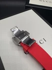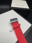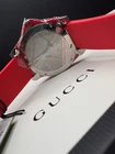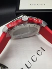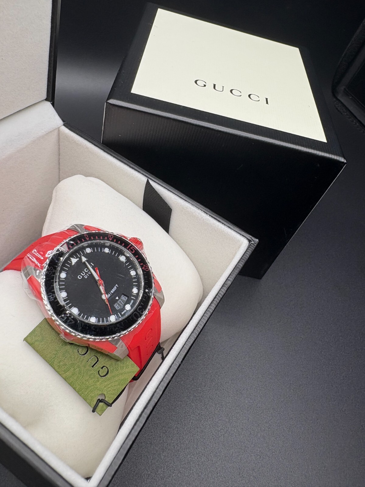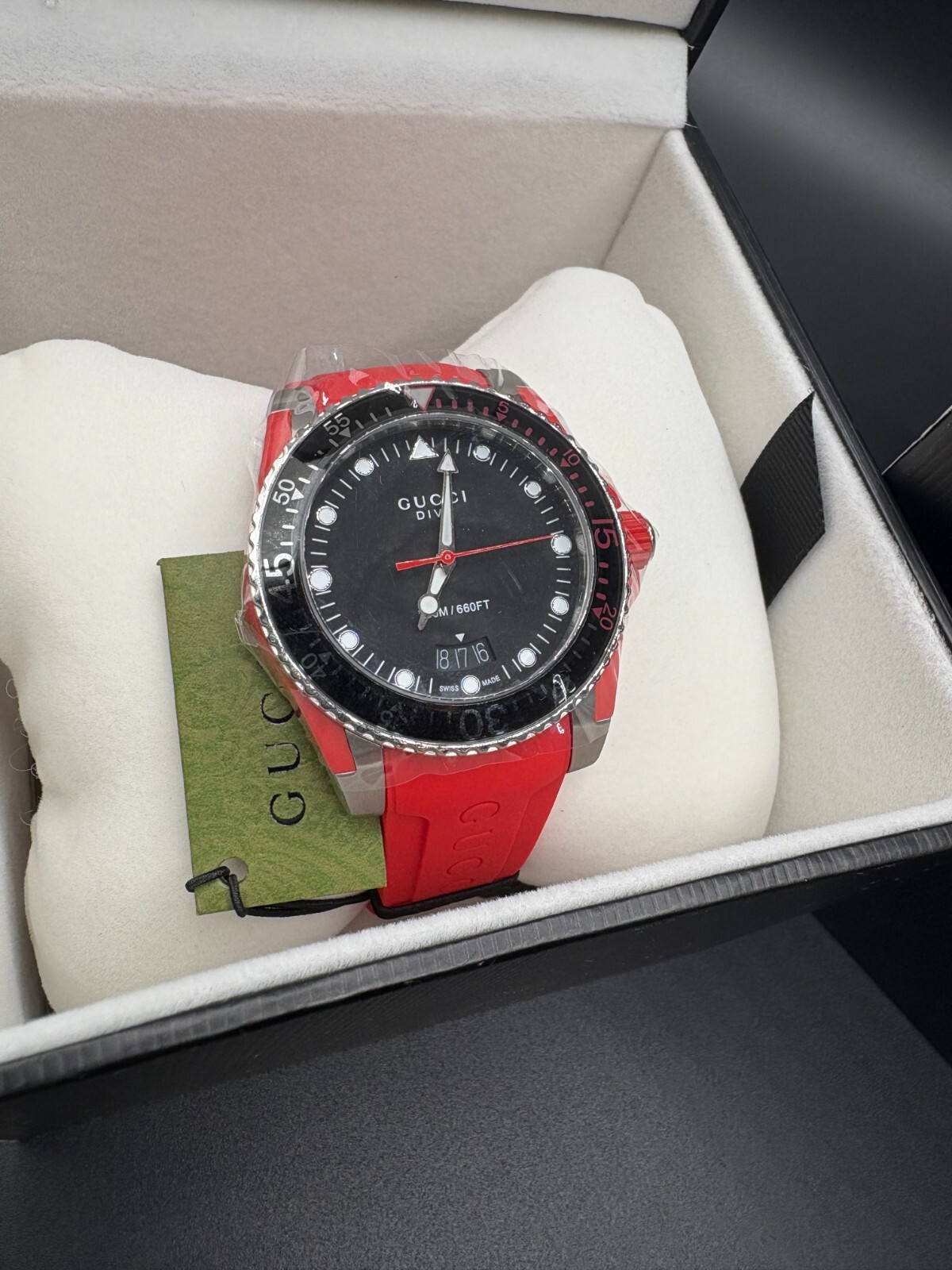 Free shipping from Miami, Florida! Delivery time 1-4 business days Product Details Case Case Thickness 11.5 mm Case Material Stainless Steel Case Shape Round Case Back Solid Band Band Material Rubber Band Type Strap Band Color Red Band Width 20 mm Clasp Fold Over Deployment Dial Dial Color Black Type Analog Crystal Scratch Resistant Sapphire Hands Luminous Silver-tone Dial Markers Dot Second Markers Minute Markers around the outer rim Luminiscence Hands and Markers Bezel Uni-directional Rotating Bezel Color Silver-tone Bezel Material Stainless Steel with a Black Top Ring Crown Screw Down Information Brand Gucci Collection Name Dive Gender Mens Model YA136310 Watch Label Swiss Made Movement Quartz Features Water Resistance 200 meters / 660 feet Calendar Date display at the 6 o'clock position Functions Date, Hour, Minute, Second Watch Features Analog, Rubber, Stainless Steel