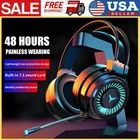 Note: The single 3.5MM plug model does not support 7.1 channel and does not support RGB backlighting!!!! Features: 1. [Flexible Microphone] Professional noise reduction technology to reduce noise and pick up sensitive sound. 2. [ANC Active Noise Reduction] Eliminate noise interference, make your voice loud and clear. 3. [Powerful Bass] 50MM speaker unit, sound field surging shock, HIFI sound quality, sound effects clearly audible. 4. [Listening Position] 7.1 surround sound, low latency game sound stereo surround sound, clearly identify the enemy position. 5. [Long Time Without Pain] Breathable earmuffs, comfortably wrapped around the ear, fit the contours of the human ear, easy to wear, not easy to fatigue. 6. [LED Seven Color Lights] 7-color RGB backlighting, accompanied by the passion of the game the atmosphere of victory can not be less. (Single 3.5MM plug models do not support RGB backlight). 7. [Wide Compatibility] 3 interfaces for your choice, suitable for desktop computers, laptops, cell phones, MP3, Xbox One, PS4, PS5. Specifications: -Product name: gaming headset -Headset type: headset -Connection port: 1) USB 7.1 channel 2) USB interface + dual 3.5MM 3) Single 3.5MM (optional) -Cable length: 2 meters (6.56 feet) -Applicable devices: desktop computer, laptop, cell phone, MP3, Xbox One, PS4, PS5. -Speaker diameter: φ50mm -Speaker sensitivity: 112dB±3dB -Frequency Response: 20Hz-20KHz -Speaker impedance: 32Ω±5 -Maximum power: 50mW -Microphone direction: omnidirectional -Microphone sensitivity: -45±3dB Packing list: 1*Gaming headset Attention: 1. Headset only, other items are not included! 2. Due to manual measurement, the product size will have 1-3cm error! 3. Due to the lighting effect and shooting angle, there may be some color difference, please understand!