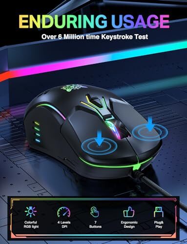 Return Policy Fast Delivery Trusted seller Gaming Mouse, Wired PC Entry Level Mouse with RGB Backlit and Adjustable DPI, Ergonomic Office Laptop Mouse, Computer Gamer Mouse with 7 Responsive Buttons for Windows/Mac/Linux/Chrome Product Description 【Gradient RGB Colors 】Dynamic colorful RGB lights up when the pc gaming mice plugged in, and RGB changes automatically to suits your style, adding to cool aesthetics your gaming setup. 【High Precision & Adjustable DPI】Equipped with a high precision optical sensor, This gaming mouse makes every movement delivered smoothly across the screen. 4 levels DPI ranges from 1200 to 3600, control DPI speed to suit your needs of every occasion! 【7 Responsive Buttons 】T are seven buttons on optical mouse: Left button, Right button, Forward, Back, DPI+/- button and Scroll wheel, allows you to easily access various commands, macros and shortcuts on your computer. 【Ergonomic Design】Breathable hollowing and skin-friendly frosted coating surface provide a comfortable grip for every gamer. this optical computer mouse fits the palm of bending curvature, ensuring the touch and long-term use experience. 【Wide Compatibility Gaming Mouse】The ergonomic rgb mouse are compatible with Windows 98/2000/ME/NT/XP/Win 7/Win8/Win10/Mac/ Linux. Plug and play, support PC,laptop, desktop, Macbook and any other usb-enable device. 【After-sales Service】 We provide excellent after-sales support service to our customer s. If you have any problems, please feel free to contact us, will answer you within 24 hours! *Note : Click the DPI+/- button, the RGB lights will flash red to alert you. If you are tired of the light, long press for 3s to turn into low light mode. DPI value will return to 1200 when you restart the connected device, Shipping Returns Payment Shipping Shipping is FREE to all addresses other than APO/PO boxes in the lower 48 states. All our stock ships from US-based warehouses. Shipped via USPS or UPS (depending on location and package weight) Unless stated otherwise, all orders will ship within 24-72 hours of your payment being processed. Check our feedback to see the great reviews of FAST shipping we offer. Returns Seller does not accept returns Payment We currently accept payment via eBay managed payments only. Once payment is cleared, we will dispatch your shipment within 1-3 business days. Please refer to the "Shipping" tab for more information regarding shipping speed to your destination.