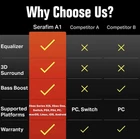 Serafim A1 Gaming Headset with Exclusive Equalizer Detachable Mic Bass Boost 3D Surround Sound for PC Xbox One Series X|S PS5 PS4 Nintendo Switch Mac iPhone Mobile 3.5mm Jack - Wired Black About this item πππππ πππ: With Serafim exclusive Audio Box technology, A1 audio effects support not only PC, but other gaming consoles and personal devices with 3.5mm jack. ππ πππππππππππππ: We provide customizable headset settings to meet all kinds of entertaining activities. With the built-in 50-millimeter directional drivers for audio precision, users are able to enjoy high quality audio performance. ππ ππππππππ: Exclusive Audio Box with built-in DSP chip, providing adjustable 3D Surround Sound for user to have a perfect balance of premium comfort and deluxe performance. ππππ πππππ: Built-in Audio Box to strengthen Bass effect and bringing phenomenal audio, no matter itβs the details of the game or the beat of the music. πππππ-πππππ πππ: Works with PS4 & PS5 controller, Nintendo Switch, Xbox One, Xbox Series X|S, PC, Macbook & iPad and support multiple mobile devices via 3.5mm jack. Long gone are the days when you had to buy separate headset for each platform.