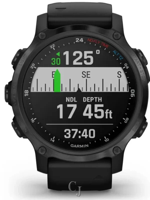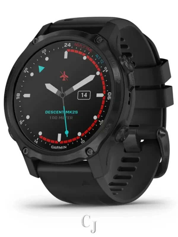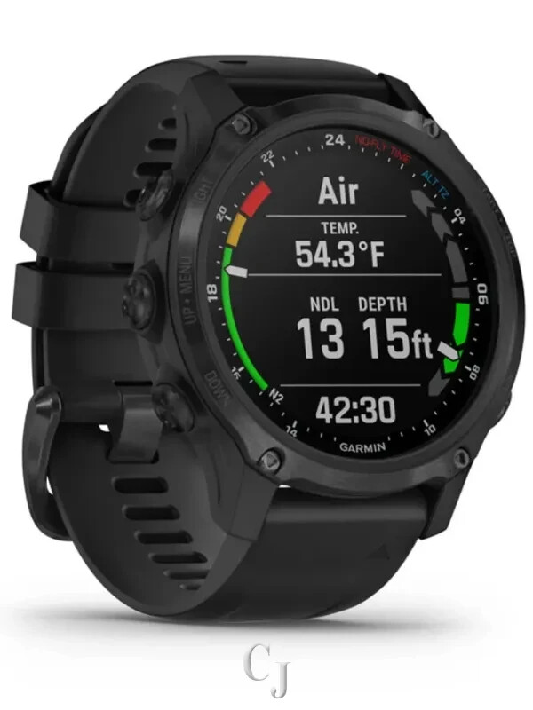 We are GARMIN Authorized Dealer. We offer 100 % Authentic Watches,Original box,Manual,certificate of Authenticity card. Explore both of your worlds — underwater and topside — with Descent™ Mk2S. This smaller watch-sized dive computer features multiple dive modes, such as single and multiple gas dives, gauge, apnea, apnea hunt and closed-circuit rebreather. Descent Mk2S also comes with an underwater 3-axis compass as well as surface GPS capabilities to mark your entry and exit points. On land, Descent Mk2S doubles as a premium multisport GPS smartwatch with multiple sports apps, estimated wrist-based heart rate monitoring, Pulse Ox (this is not a medical device and is not intended for use in the diagnosis or monitoring of any medical condition) sensor and advanced training features. It also offers Garmin Pay™ contactless payments (not all countries and payment networks are eligible), music storage and smart notifications (when paired with a compatible smartphone) and can fit any style with your interchangeable QuickFit® bands. GARMIN DESCENT MK2S CARBON GRAY DLC W/ BLACK SILICONE BAND 010-02403-03 GENERAL Lens Material sapphire crystal Bezel Material stainless steel Case material fiber-reinforced polymer QuickFit™ watch band compatible yes (20 mm) Strap material silicone Physical size 43 x 43 x 14.15 mm Color display Display size 1.2” (30.4 mm) diameter Display resolution 240 x 240 pixels Display type sunlight-visible, transflective memory-in-pixel (MIP) Weight silicone band: 60 g case only: 41 g Battery life Smartwatch: Up to 7 days Battery Saver Watch Mode: Up to 21 days GPS: Up to 18 hours GPS + Music: Up to 6 hours Max Battery GPS Mode: Up to 32 hours Dive mode: Up to 30 hours Water rating Dive (100 meters) Memory/History 32 GB CLOCK FEATURES Time/date GPS Time Sync Automatic daylight saving time Alarm clock Timer Stopwatch Sunrise/sunset times HEALTH MONITORING Wrist-based Heart Rate (constant, every second) Daily Resting Heart Rate Abnormal Heart Rate Alerts yes (high and low) Respiration rate (24×7) Pulse Ox Blood Oxygen Saturation yes (spot-check, and optional all-day acclimation and in sleep) Fitness Age yes (in app) Body Battery™ Energy Monitor All-day Stress Relaxation reminders Relaxation breathing timer Sleep yes (Advanced) Sleep score and insights Hydration yes (in Garmin Connect™) Woman’s Health yes (in Garmin Connect™) SENSORS GPS GLONASS Galileo Garmin Elevate™ wrist heart rate monitor Barometric altimeter Compass Gyroscope Accelerometer Thermometer Depth sensor Pulse Ox Blood Oxygen Saturation Monitor yes (with Acclimation) DAILY SMART FEATURES Connectivity Bluetooth® Smart, ANT+®, Wi-Fi® Connect IQ™ (downloadable watch faces, data fields, widgets and apps) Smart Notifications Text response/reject phone call with text (Android™ only) Calendar Weather Battery saver (customizable low power watch) Controls smartphone music Plays and controls watch music Music storage up to 2,000 songs Find My Phone Find My Watch VIRB® Remote Smartphone compatibility iPhone®, Android™ Pairs with Garmin Connect™ Mobile Garmin Pay™ SAFETY AND TRACKING FEATURES LiveTrack Group LiveTrack Live Event Sharing Incident Detection during select activities Assistance DIVING FEATURES Dive activity maximum operating depth 100 meters Single-gas mode Multi-gas mode Gauge mode APNEA mode APNEA hunt mode Decompression model Bühlmann ZHL-16c with gradient factors Nitrox support Trimix support Closed Circuit Rebreather (CCR) Gas mixes Air, Nitrox and Trimix, up to 100% O2; 1 bottom gas and up to 11 deco and/or backup gasses. PO2 Up to 2.0 with customizable deco PO2 setting Auto start/end dive Custom end-dive timeout yes (20s to 10 m) Safety Stop yes (customizable off/3min/5min) Deep Stops yes (using custom gradient factors) Customizable conservatism yes (low/medium/high or custom using gradient factors) Dive ascent/descent rate indicator Automatic altitude adjustment No fly time yes (with 24hr countdown) Dive planner yes (basic NDL + multi-gas deco planner) Tides Backlight yes (configurable time and intensity; auto-on at depth) Automatically saves dive entry and exit locations Custom dive data screens Sync dive log to Garmin Dive™ Mobile app Alerts & alarms Audible and vibration alarms for ascent rate, PO2, CNS/OTU, NDL, deco, gas switching. Customizable (up to 40) audible and/or vibration per dive mode, based on depth or time 3-axis dive compass yes (with adjustable heading, quick change to 90R, 90L and reciprocal). Indicates degrees and direction back to set heading Missed Deco Lockout yes (can be disabled prior to dive with user acknowledgement) Residual Tissue Loading Reset yes (on the surface with user acknowledgement) Surface diver status widget yes (surface interval, N2/HE loading, CNS, OTU and tissue compartment status) TACTICAL FEATURES DUAL GRID COORDINATES BOATING FEATURES Available Boating Profiles Boating Built-in barometer and tide tables ACTIVITY TRACKING FEATURES Step counter Move bar (displays on device after a period of inactivity; walk for a couple of minutes to reset it) Auto goal (learns your activity level and assigns a daily step goal) Calories burned Floors climbed Distance traveled Intensity minutes TrueUp™ Move IQ™ Garmin Connect™ Challenges app yes (optional Connect IQ app) GYM & FITNESS EQUIPMENT Available gym activity profiles Strength, Cardio and Elliptical Training, Stair Stepping, Floor Climbing, Indoor Rowing, Pilates and Yoga Cardio workouts Strength workouts Yoga workouts Pilates workouts On-screen workout animations Automatic rep counting TRAINING, PLANNING AND ANALYSIS FEATURES HR zones HR alerts HR calories % HR max % HRR Recovery time Auto max HR HRV stress test (measures your heart rate variability while standing still, for 3 minutes, to provide you with an estimated stress level; the scale of this is 1 to 100; low scores indicate lower stress levels) yes (with compatible accessory) HR Broadcast (broadcasts HR data over ANT