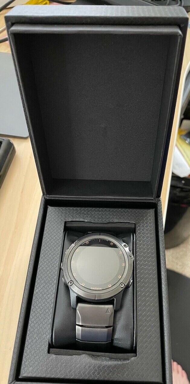Garmin Fenix 5X Plus Sapphire, Carbon Gray Case with Titanium Band (010-01989-04) Like new condition No scratches or dents Includes original box, charging cable, black silicone band + titanium band. All accessories are genuine Garmin
