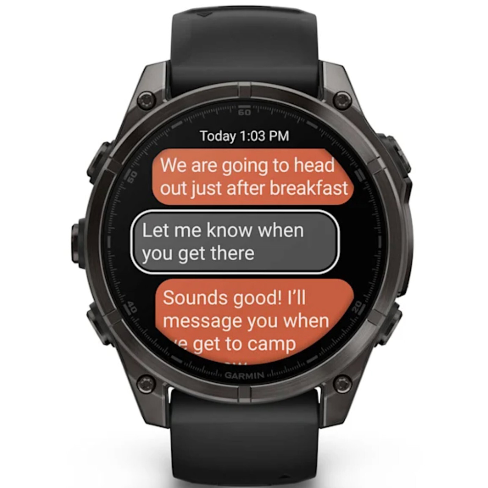 Garmin 010-02904-20 Fenix 8 Sapphire Titanium Smartwatch GPS Watch - 47mm AMOLED BE LIMITLESS For serious athletes and adventurers who want to push beyond their limits, this premium multisport GPS smartwatch is built to perform — with advanced strength training features, dive capability, an internal speaker and mic for voice features, a built-in LED flashlight and more. BRIGHT, CRISP AMOLED DISPLAY UP TO 29 DAYS OF BATTERY LIFE IN SMARTWATCH MODE SPEAKER AND MICROPHONE FOR VOICE MESSAGING 1 AND CONTROL BRIGHT BUILT-IN LED FLASHLIGHT SPORT-SPECIFIC STRENGTH WORKOUTS RUGGED BY DESIGN Built to endure, this premium design is dive-rated and features leakproof buttons, a metal sensor guard cover and bright 1.4” AMOLED display with options for a scratch-resistant lens and titanium bezel. It’s tested to U.S. military standards for thermal, shock and water resistance. BUILT-IN SPEAKER AND MICROPHONE Make and take phone calls from your watch when it’s paired to your smartphone. Plus, control watch functions with off-grid voice commands — or use your smartphone’s voice assistant to respond to text messages and more. BUILT-IN LED FLASHLIGHT A true integrated flashlight with variable light intensities and a red safety light gives you greater awareness in the dark, providing convenient illumination when you need it. Strobe mode can even match your running cadence. ADVANCED STRENGTH TRAINING Elevate your body’s performance with targeted strength training plans and sport-specific workouts for athletes of all types. KNOWLEDGE IS POWER Begin each day with a customizable morning report offering a summary of health and wellness information. Use the training readiness feature, which looks at a variety of health metrics, to maximize your training efficiency and recovery 2 — to help prevent burnout. ENHANCED MAP NAVIGATION A dynamic round-trip routing feature lets you enter how far you want to go — and get suggested routes that will guide you back on time. You can also view terrain contours on TopoActive maps 3 and access preloaded maps for golf courses and ski resorts around the world. PERFORMANCE FEATURES ENDURANCE SCORE Using your VO2 max, training loads and other factors, this feature helps gauge your ability to sustain prolonged effort . VISUAL RACE PREDICTOR Get an estimate of what your pace could be for a 5K, 10K, half-marathon and marathon. PACEPRO ™ TECHNOLOGY Plan race-day strategy with GPS-based pace guidance for a selected course or distance. CLIMBPRO FEATURE See real-time information on your current and upcoming climbs on downloaded courses. GRADE-ADJUSTED PACE Get your equivalent running pace at the same effort on flat ground or when ascending. TRAINING READINESS From the moment you wake up, get a readiness score based on your sleep quality 2 , recovery, training load and more, so you can determine if it’s a good day to go hard — or take it easy. TRAINING STATUS Get insight , and know whether you’re training productively, peaking or strained. PERFORMANCE METRICS Gauge your performance with advanced training metrics such as VO2 max , training load and more. MULTISPORT AUTO TRANSITION This feature detects sport changes between swim, bike and run in multisport activities — so you can focus on the race and let your watch take care of recording splits. HILL SCORE Measure your capability for running uphill , and evaluate your progress over time based on your VO2 max and training history. DAILY SUGGESTED WORKOUTS View your entire week of daily suggested workouts , which adapt after every run or ride. RECOVERY TIME Know how long you need to recover before your next high-effort workout based on your latest training. RACE WIDGET Prepare for your next race with training tips, personalized daily suggested workouts and more. WRIST-BASED RUNNING DYNAMICS View crucial running metrics such as cadence, stride length, ground contact time and more. GARMIN COACH Prepare for your next race, train for a milestone, or simply improve your fitness with Garmin Coach adaptive or prebuilt training plans . ACTIVITIES AND FUNCTIONS TRACK YOUR ACTIVITIES Use preloaded activity profiles to get data and insight from your active pursuits. Even track team sport activities such as soccer, football, racquet sports and more. RECREATIONAL DIVING A 40-meter dive rating and leakproof metal buttons let you reach new depths with support for scuba and apnea dive activities. HIIT WORKOUTS Track your HIIT workouts, including AMRAP, EMOM, Tabata or custom workouts. ANIMATED WORKOUTS Follow animated workouts for cardio, strength, yoga and Pilates on the watch screen. BACKCOUNTRY SKI AND SNOWBOARD Get ascent and descent data along with metrics such as cadence, stride length and grade. XC SKI POWER Measure exercise load when paired with an HRM-Pro ™ Plus chest strap (sold separately). SURF ACTIVITY Record waves surfed, maximum speed reached, distance traveled and more. Use Surfline Sessions ™ technology to capture video of waves you ride in front of a Surfline ® camera. MTB DYNAMICS Track the details of your ride with specialized Grit ® and Flow ™ measurements. FIND YOUR WAY OUTDOOR MAPS+ Subscribe to Outdoor Maps+ for premium mapping content, such as satellite imagery and enhanced topographic maps, downloaded directly to your watch. SATIQ ™ TECHNOLOGY Get superior positioning accuracy with multi-band GPS while optimizing battery life. ABC SENSORS Navigate your next trail with an altimeter, barometer and 3-axis electronic compass. MULTICONTINENT TOPO MAPS TopoActive maps 3 from around the world keep your explorations on track. Download additional maps via Wi-Fi ® connectivity. NEXTFORK ™ MAP GUIDE Navigate with a quick glance, and see the distance to the next intersection and the trail name. UP AHEAD FEATURE Get at-a-glance awareness for selected POI checkpoints ahead — such as aid stations — during a race. COURSES WITH TURN-BY-TURN DIRECTIONS Create or find existing courses in the Garmin Connect ™ 