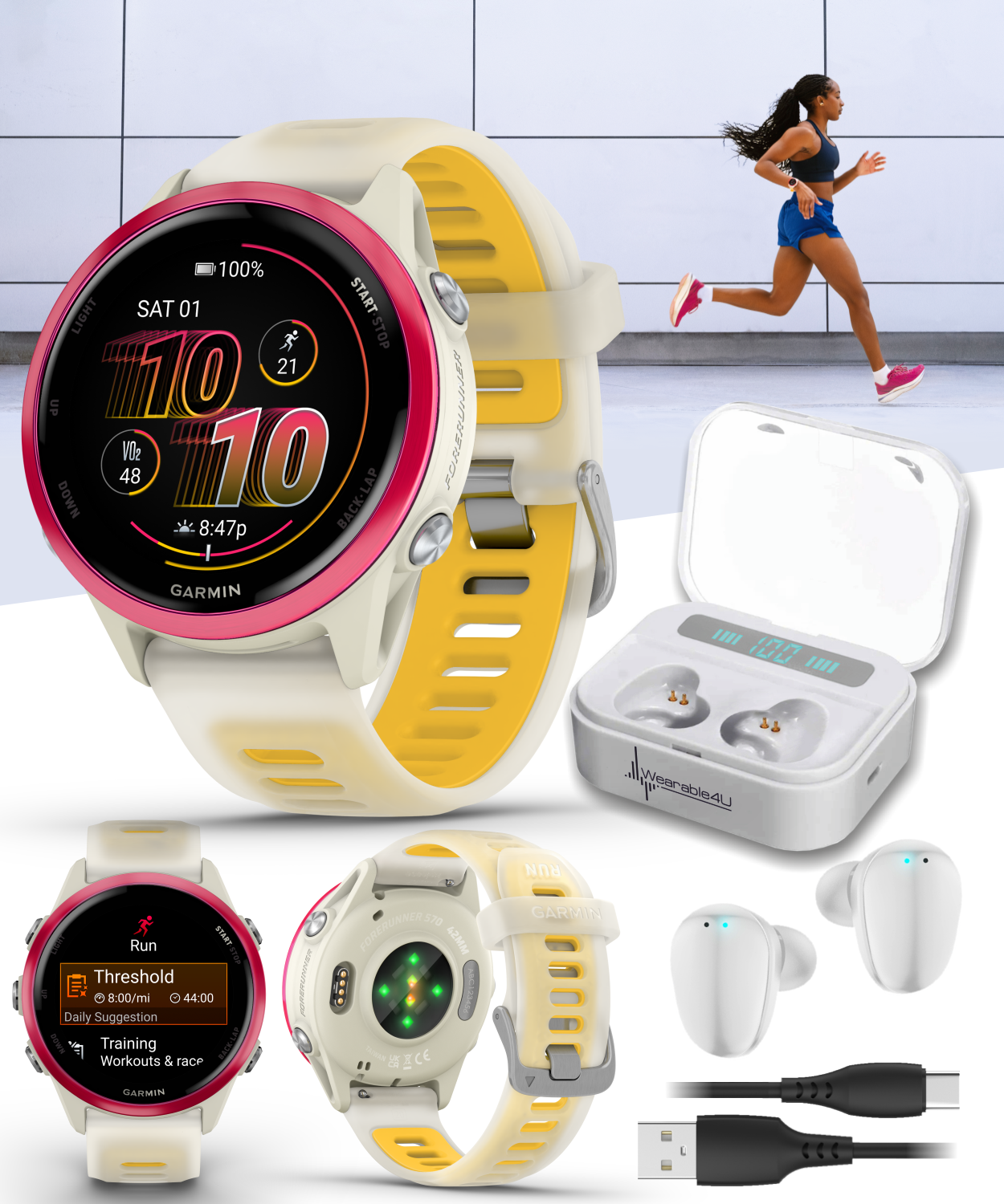 About us Contact Us Feedback Listings Shop Garmin Forerunner 570 42mm/47 mm, Advanced GPS Running and Triathlon Smartwatch, AMOLED Display, Training & Recovery Features with Wearable4U Bundle < Description Contact Us Buy with Confidence For dedicated runners chasing goals, there’s Forerunner 570 — the GPS running smartwatch with our brightest AMOLED display, aluminum bezel and smaller size to fit smaller wrists. Get ready for your race with personalized plans from Garmin Coach for running and triathlons — and select plans adapt based on your performance and recovery. Use the training readiness feature to know when you’re primed for a productive workout, and use training status to know if you’re training productively. With multi-band GPS, you’ll get superior positioning accuracy in challenging environments. Forerunner 570 has a built-in speaker and microphone so you can make or take calls from your wrist (when paired to your smartphone). Before heading to bed, check your evening report, which helps you prepare for the next day with reminders of sleep needs, tomorrow’s workout, weather and more. You’ll always be ready to hit the ground running with up to 10 days of battery life in smartwatch mode and up to 18 hours in GPS mode . Key Features: Вrightest AMOLED touchscreen display with button controls and an aluminum bezel in 42 mm/47 mm size to fit smaller wrists Up to 10/11 days of battery life in smartwatch mode and up to 18 hours in GPS mode for a more complete picture of your training and recovery. Train for an event, achieve a milestone, or improve your fitness with Garmin Coach training plans; these running and triathlon plans are personalized to you and adapt based on your performance and recovery Training readiness score is based on sleep quality, recovery, training load and HRV status to determine if you’re primed to go hard and get the most out of your workout (data presented is intended to be a close estimation of metrics tracked) Built-in microphone and speaker let you make and take phone calls from your wrist when your watch is paired to your smartphone — and you can even use your smartphone’s voice assistant to respond to text messages and more Using indicators such as HRV status, recent exercise history and VO2 max, get insight into training effectiveness with training status — and know whether you’re training productively, peaking or strained (data presented is intended to be a close estimation of metrics tracked) Get personalized daily suggested workouts adapted to match performance and recovery. Wake up to your morning report with an overview of sleep, recovery and training outlook alongside HRV status, training readiness and weather (data presented is intended to be a close estimation of metrics tracked); before you go to bed, you’ll get an evening report with reminder of sleep needs, tomorrow’s workout, weather and events 30+ built-in activity profiles include running, triathlon, track run, cycling, open-water swimming and more. Safety and tracking features, including incident detection (during select outdoor activities) and Assistance, send a message with your live location to emergency contacts when paired with your compatible smartphone; requires setup and your smartphone to be in an area with network coverage where data connectivity is available Pay on the go with Garmin Pay contactless payments (with a supported country and payment network); listen on the go with downloaded songs and playlists from Spotify, Amazon Music or Deezer (subscription required), and connect with your wireless headphones for phone-free listening See your health and fitness information, connect and compete with friends, sign up for challenges to earn badges and more in the Garmin Connect smartphone app Garmin Forerunner 570 Advanced GPS Running and Triathlon Smartwatch Specifications: Display type: AMOLED Touchscreen: Yes Water rating: 5 ATM Strap material: silicone Lens Material: Corning Gorilla Glass 3 Bezel Material: aluminum Weight: 42 g / 50 g Built-in speaker/microphone: Yes Display Size: 1.2" (30.4 mm) diameter / 1.4" (35.3 mm) diameter Display resolution: 390 x 390 pixels / 454 x 454 pixels Color display: Yes Battery life (smartwatch mode): Up to 10/11 days Memory/History: 8 GB Connectivity: Bluetooth, ANT+, Wi-Fi IN THE BOX (Smartwatch Only): 1x Forerunner 570 GPS running watch; charging cable; documentation IN THE BOX (+Power Bank): 1x Forerunner 570 GPS running watch; charging cable; documentation; 1x Wearable4U PowerBank IN THE BOX (+Black EarBuds): 1x Forerunner 570 GPS running watch; charging cable; documentation; 1x Wearable4U Black EarBuds IN THE BOX (+White EarBuds): 1x Forerunner 570 GPS running watch; charging cable; documentation; 1x Wearable4U White EarBuds Also In The Box (Choose Your Bundle Option): Wearable4U Power Bank Keep your devices charged at all times with our Wearable4U Power Bank. Compatible with all popular USB-powered devices including most smartphones, GPS and fitness trackers, smart watches, wireless speakers, bluetooth headphones, and more. Enjoy! W earable4U Ultimate EarBuds + Power Pack Bundle: Wearable4U 2in1 Earbuds Pro + Power Bank 1500 mAh Working Time: Call / Music 4h Standby time: 300h Waterproof level: earphone ipx6 Operation mode: touch Enjoy! Garmin Forerunner 570 | Advanced Running Smartwatch Please use eBay's internal messaging system to get a hold of us. Please remember to leave positive feedback if you are satisfied with the order. If you are not satisfied please contact us and we will do our best to solve the problem or refund your order. Contact Us FREE SHIPPING We aim to ship orders placed before 3pm Monday to Friday the same day, orders placed after this time will be posted next working day. Orders placed on weekends and bank holidays will be posted the next working day. All items are sent via USPS, FedEx or UPS post. Postage is combined for multiple purchases. Please request an invoice for reduced postage