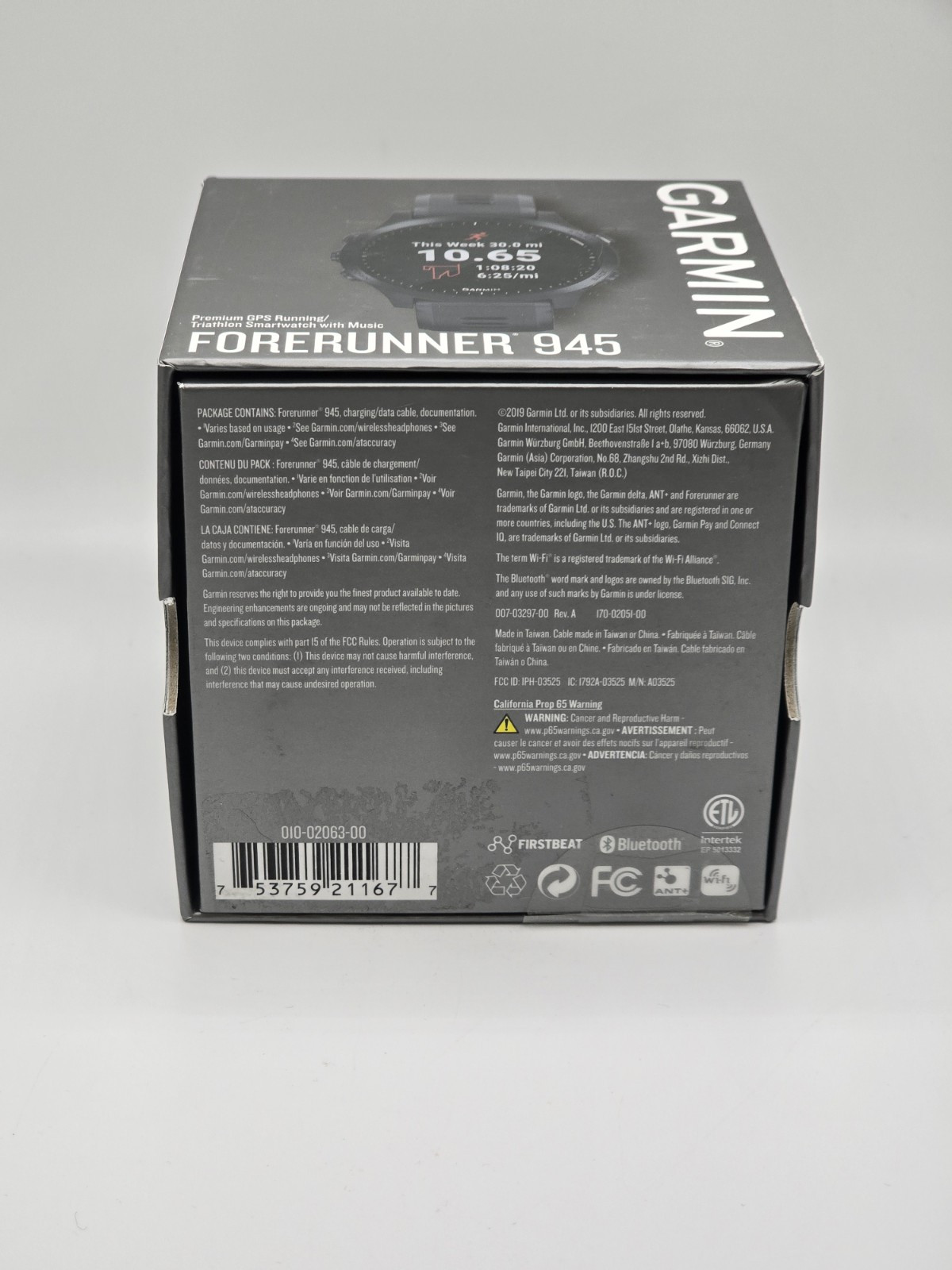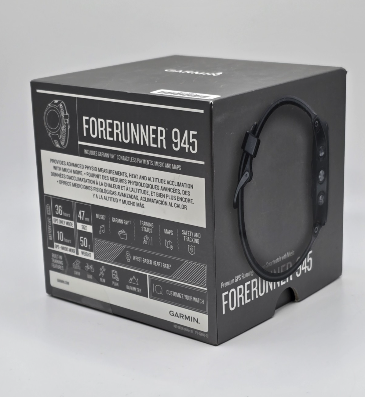 Sport/Activity:Swimming, Running & Jogginggtin13:0753759211677UPC:0753759211677Color:BlackFeatures:Timer, Rechargeable Battery, Distance Traveled, Speedometer, Alarm, Stopwatch, GPS, Calorie MonitorMPN:010-02063-00Model:Garmin Forerunner 945Seller Notes:“Costumer return, looks open box, powers on but not tested, what you see is included.”Brand:GarminType:Smartwatch