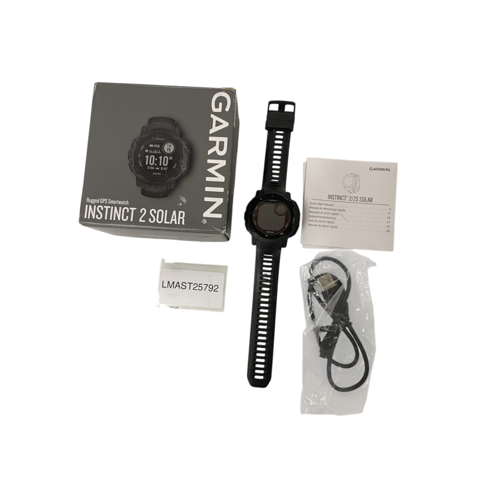New in Open Box Garmin Instinct 2 Solar Charging Rugged GPS Smartwatch Outdoor in Graphite New in Open Box Garmin Instinct 2 Solar Charging Rugged GPS Smartwatch Outdoor in Graphite WHATEVER YOU DO, OWN IT This rugged, solar charging GPS smartwatch is tough enough to keep up with you and unique enough to fit your style. Now it comes in two sizes to fit every wrist. This watch is tough, which means no holding back. Train your way with built-in sports apps at the wrist. Smart notifications so you don’t miss out on what matters. Push boundaries, but stay on track with access to more satellites. Understand your body better with 24/7 health monitoring. Keep your experiences going with unlimited battery life in smartwatch mode with solar charging. ENGINEERED FOR ENDURANCE This rugged watch is water-rated to 100 meters and is thermal and shock resistant. Plus, with a fiber-reinforced polymer case and chemically strengthened, scratch-resistant Corning Gorilla Glass, this device is built to endure. DESIGNED TO DO YOU Bold colors, high-contrast displays and size options let you show the world that you do things your own way. GET MORE BATTERY OUT OF LIFE Go longer than ever with solar charging with unlimited battery life in smartwatch mode. Plus, power manager lets you extend battery life by controlling what settings and sensors draw power. MULTI-GNSS SUPPORT Whether you’re hiking, mountain biking, trail running or skiing, you’ll have access to multiple global navigation satellite systems (GPS, GLONASS and Galileo) to track in more challenging environments than GPS alone. ABC SENSORS Navigate your next trail with ABC sensors, including an altimeter for elevation data, barometer to monitor weather and 3-axis electronic compass. TRACBACK ROUTING Take the guesswork out of your return journey by using this feature to navigate the same route back to your starting point. SMART NOTIFICATIONS Receive emails, texts and alerts right on your watch when paired with your compatible smartphone. CONNECT IQ STORE Download custom watch faces, add data fields, and get apps and widgets from the Connect IQ Store app on your compatible smartphone. GARMIN PAY CONTACTLESS PAYMENTS Breeze through checkout lines and select transit systems with Garmin Pay contactless payments through participating providers. SAFETY AND TRACKING FEATURES When your watch and phone are paired, your live location can be sent to your contacts manually or — during select outdoor activities — automatically with built-in incident detection. CALENDAR VIEW Easily see your plans for the day with a dedicated calendar screen when paired with your compatible smartphone. SYNC WITH THE GARMIN CONNECT APP See your health and fitness information all in one place. The Garmin Connect app on your compatible smartphone is a thriving online community where people on the go can connect, compete and share. BUILT-IN SPORTS APPS Do whatever you love with preloaded activity profiles for running, cycling, swimming, strength training, indoor climbing, virtual running, golf, yoga and more. HIIT WORKOUTS This activity profile tracks your HIIT workouts, including AMRAP, EMOM, Tabata and custom. Set the number of rounds, work/rest intervals and more. VO2 MAX Train smarter with VO2 max, an indicator of how you can expect to perform. It even accounts for changes in performance that could be caused by heat or altitude. DAILY WORKOUT SUGGESTIONS For training guidance that takes you and your fitness level into account, get daily recommendations based on your current training load and training status. RECOVERY TIME After each workout, recovery time lets you know when you’ll be ready for another hard workout. It even accounts for training intensity and factors such as stress, daily activity and sleep. MTB DYNAMICS Track the details of every ride with mountain biking metrics plus specialized Grit and Flow measurements that rate trail difficulty and how smoothly you descend, giving you a score to beat next time. WRIST-BASED HEART RATE Get estimated heart rate data along with alerts if your heart rate stays too high or too low while you’re at rest. Gauge how hard your heart is working during activities. STRESS TRACKING Heart rate variability is used to calculate your stress level score, so you can see if you’re having a calm, balanced or stressful day. SLEEP SCORE AND ADVANCED SLEEP MONITORING Get a full breakdown of your light, deep and REM sleep stages. View it all on a dedicated widget that includes your sleep score and insights. BODY BATTERY ENERGY MONITORING Optimize your body’s energy reserves, using heart rate variability, stress, sleep and other data to gauge when you’re ready to be active or when you may need to rest. PULSE OX For altitude acclimation or sleep monitoring, a Pulse Ox sensor uses light beams at your wrist to estimate how well your body is absorbing oxygen. FITNESS AGE This feature uses chronological age, your weekly vigorous activity, resting heart rate and BMI to estimate if your body is younger or older than you are. Get tips to lower your fitness age. INTENSITY MINUTES Track how many minutes of vigorous activity you’re getting, when you earn them and during what activity. You can even view them as a data field during timed activities. WOMEN’S HEALTH TRACKING Use the Garmin Connect app to track your menstrual cycle or pregnancy. Log symptoms, get exercise and nutrition education, and more. Features General LENS MATERIAL: Power Glass™ BEZEL MATERIAL: fiber-reinforced polymer CASE MATERIAL: fiber-reinforced polymer QUICKFIT™ WATCH BAND COMPATIBLE: yes (22 mm) STRAP MATERIAL: silicone PHYSICAL SIZE: 45 x 45 x 14.5 mm (Fits wrists with a circumference of 135-230 mm) DISPLAY SIZE: custom, two-window design; 0.9” x 0.9” (23 x 23 mm) DISPLAY RESOLUTION: 176 x 176 pixels DISPLAY TYPE: monochrome, sunlight-visible, transflective memory-in-pixel (MIP) WEIGHT: 53 g BATTERY LIFE: Smartwatch: Up to 28 days/Unlimited with solar* Battery Sav