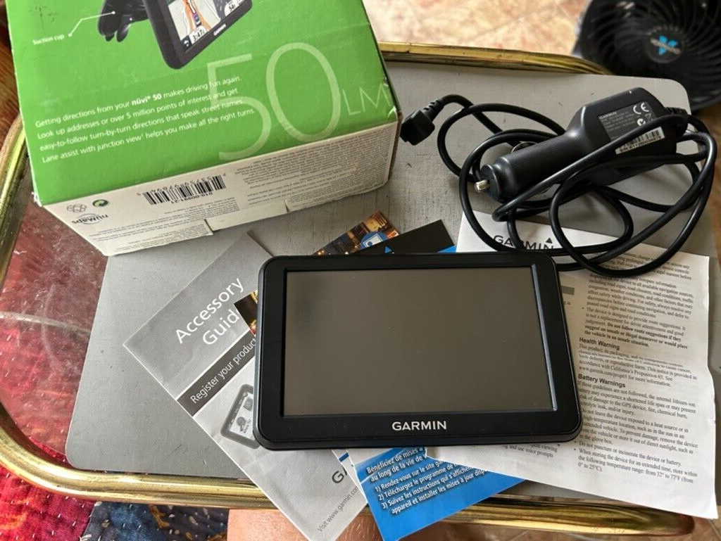 The Garmin Nuvi 50 GPS has a 5" screen size and comes with original box and cord. The system offers lifetime map updates, waypoint icons and calculator. The Garmin GPS is perfect for those with older cars with out an onboard one. It's also great for makers that need a 5" touch screen or GPS antenna and chipset. Used but works great. Includes box, charge cable and battery holds a charge. Mount included. Please see photos.
