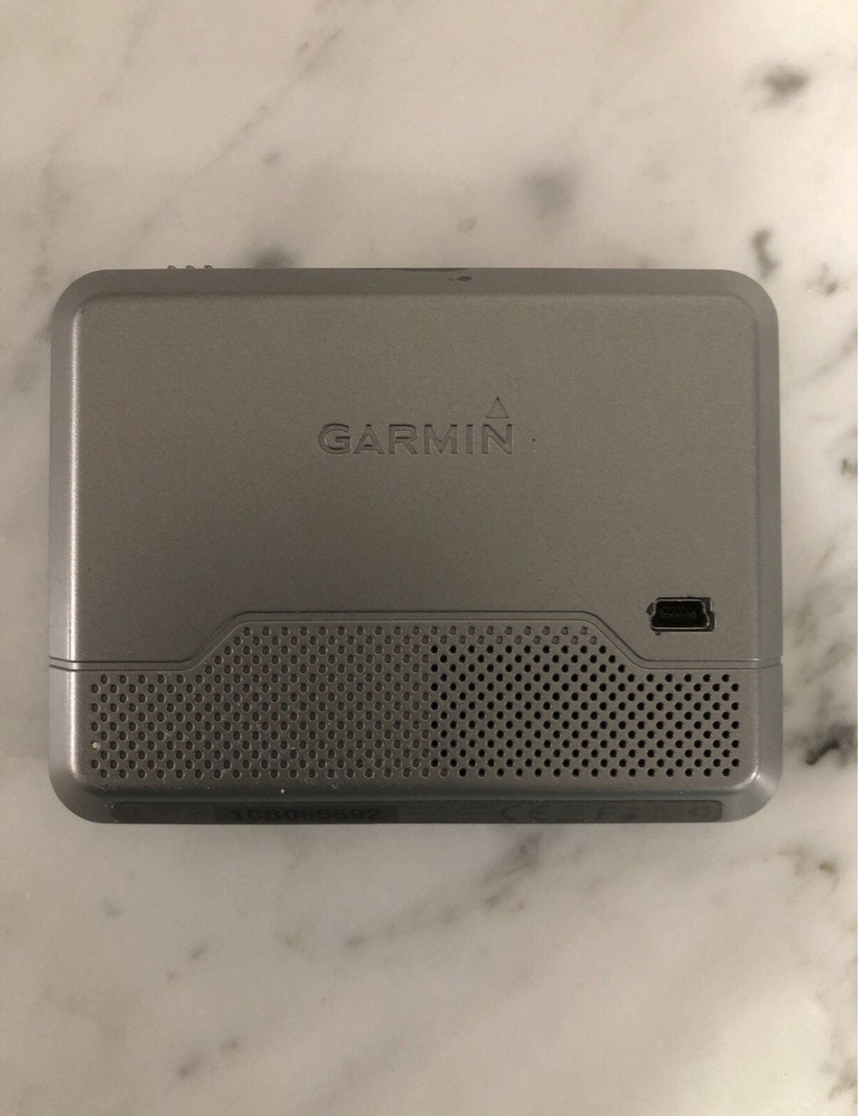 Garmin Nuvi GPS With Car Accessories. Gently used. Measures 4”W x 3”L x 3/4”D. Silver color. Screen is medium gray color when unit is turned off.