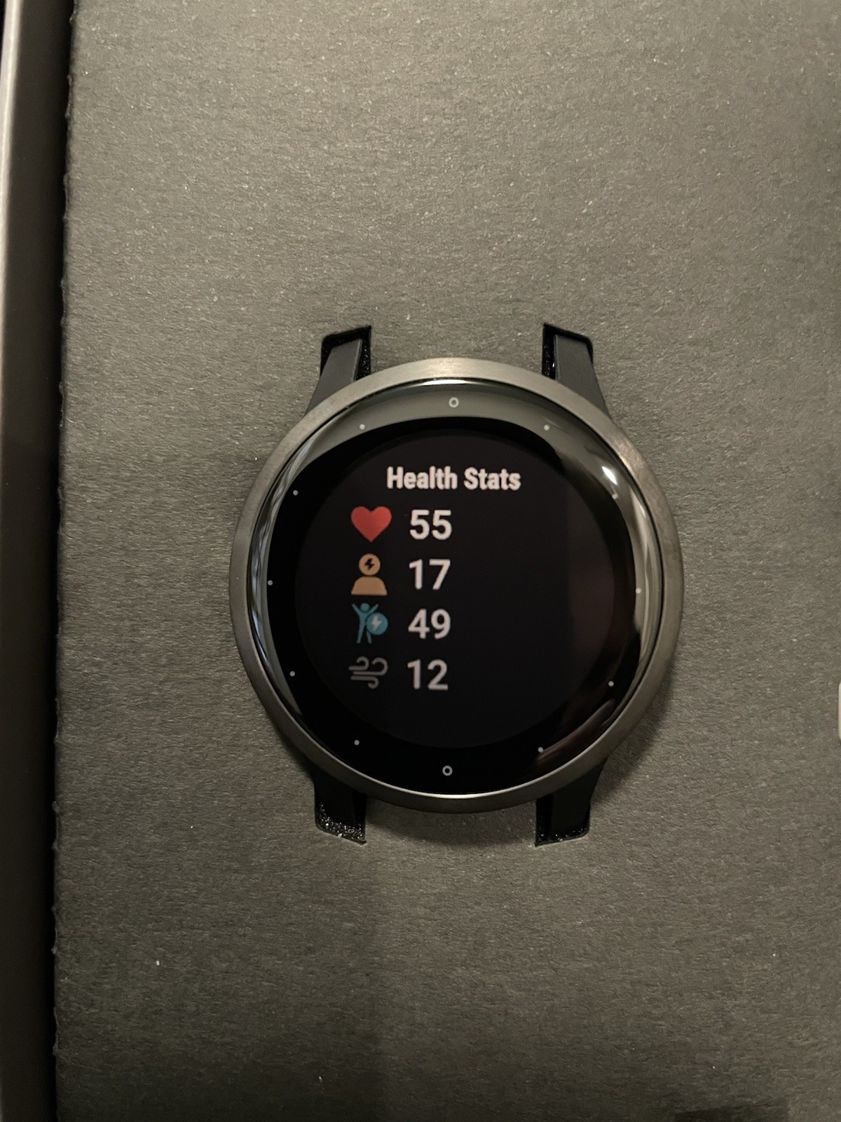 *New in box, never worn* This Garmin Vivoactive 4S Smartwatch has a 40 mm black watch case/slate bezel, and comes with a custom 18 mm white/slate silicone band and additional 18 mm black/slate silicone band (both bands are for Small/Medium wrists). Power tested with no issues. Includes charge cable and owner's manual.