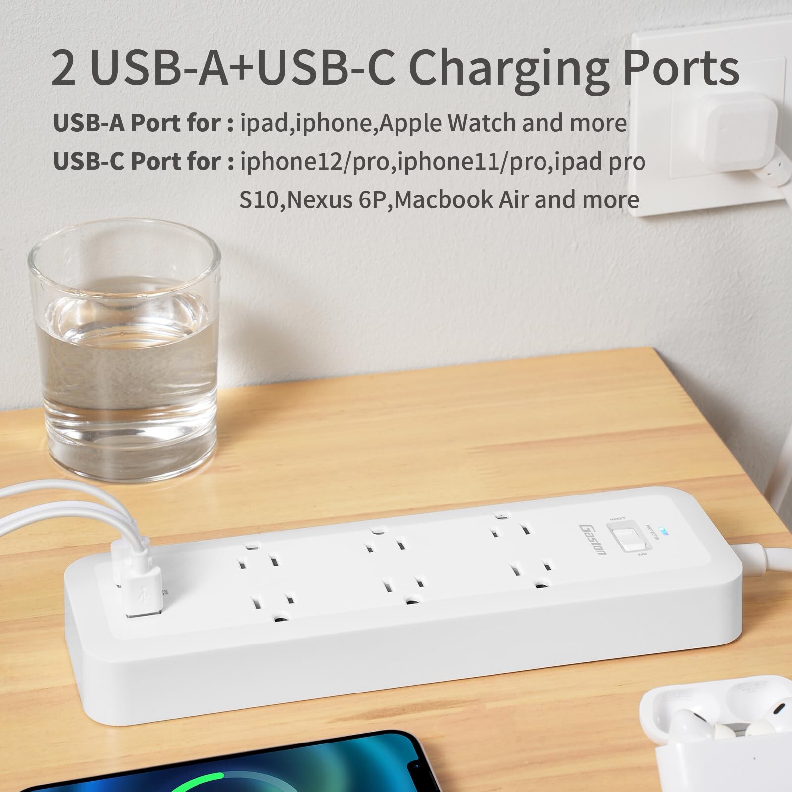 Gaston Surge Protector Power Strip - 5 Ft Plug Extension Cord, 6 Widely Outlets, 3 USB Ports(1 USB C), 1 Side Outlet Extender for Home Office, White, ETL Listed Product Details Brand: KTMC Color: White Total Power Outlets: 6 Voltage: 125 Special Feature: Mountable Package Dimensions: 11.57 x 3.43 x 2.4 inches Item Weight: 1.3 pounds Item model number: 20615-5FT Date First Available: August 6, 2024 Manufacturer: KTMC Country of Origin: China Gaston Surge Protector Power Strip - 5 Ft Plug Extension Cord, 6 Widely Outlets, 3 USB Ports(1 USB C), 1 Side Outlet Extender for Home Office, White, ETL Listed 6-in-3 Surge Protector power bar, USB fast charging station :6 AC sockets 125V/15A/1875W, 1 USB-A port 5V/2.4A MAX, 2 USB-C ports 5V/3A MAX, 3 USB ports total 5V/3.1A output. Equipped with a smart charging system with surge protection that automatically detects and provides the best charging speed for your electronic devices.