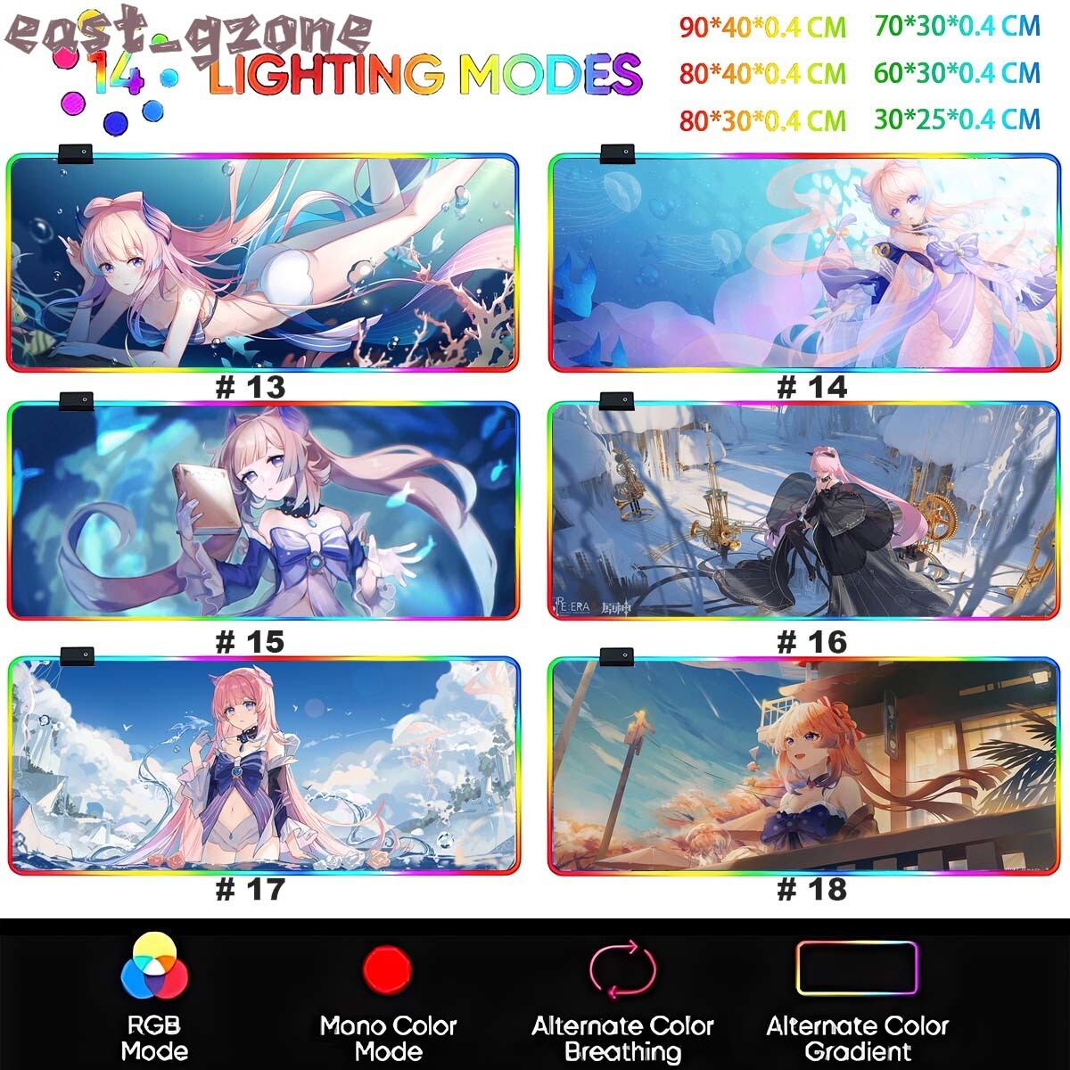 Store Categories Store Categories Console Accessories Keyboard keycaps Genshin Impact Other Mouse pad pro Genshin Impact Sangonomiya Kokomi LED Keyboard Desk Gaming Mat Product Description 【Multiple RGB Lighting Modes】 This extra-thick RGB gaming mouse pad features Multiple lighting modes. 【Anti-slip Rubber Base】 The base is made of natural rubber, which firmly fixes the mouse pad on the desktop and prevents the mouse pad from moving. 【Large Size & Waterproof Surface】 The oversize of 31.5*15.7 inches will fit for your mouse and keyboard perfectly 【No Need to Charge, USB Plug and Play】 Powered by USB and no driver required. Size:(Optional) 90x40cm (35.5x15.7 inch) 80x40cm (31.5x15.7 inch) 80x30cm (31.5x11.8 inch) 70x30cm (27.5x11.8 inch) 60x30cm (23.6x11.8 inch) 30x25cm (11.8x9.8 inch) Thickness: 4mm You can choose from our existing images Or custom for your favorite image,just send it to us via message after the payment have be done. Payment Policy Shipping Policy About us Payment Policy 1.All major credit cards are accepted through secure payment processor. 2.Payment must be received within 7 business days of auction closing. 3.We ship to your eBay address. Please make su re your eBay address is correct before you pay. Shipping Policy 1.We ship to your eBay. Please make sure your eBay address is correct before you pay. 2.Items will be shipped within 1-3 business day when we received payment. 3.Delivery time depends on destination and other factors; 4.International buyers please note: a.Import duties, taxes and charges are not included in the item price o r shipping charges. These charges are buyer’s responsibility. We will try our best to reduce the risk of the custom duties. b.Please check with your country's customs office to d etermine what these additional costs will be prior to buying. About us We do our best to value every customer a 5-star positive eBay experience by working hard and professional. We also provide accurate information for our products, prompt communication and reasonable and fair price (the balance between price and quality) to our customers. We are welcome and happy if you have any issues, problems or suggestions. Please feel free to email us thru eBay. If there is no response after contacting us several times, please check your email spam folder. Please DO NOT Leave us Neutral or Negative Feedback without telling us in advance. We will do our best to help you to resolve your problems. We reply any email messages within 1 business / working days; Our Bu siness hours: Mon-Fri 9:00-18:00, UTC/GMT +8 h ours. Copyright © 2023 Dianxiaomi