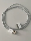 Lot of three (3) genuine Apple charging products. Includes: Q:(1) USB-C to lightning cable (1 m) - new without packaging Q:(1) 30 pin to USB 2.0 cable - like new Q:(1) 5W wall charger adapter cube model A1385 - like new All items hallmarked with Apple identification. Sold as described and pictured.