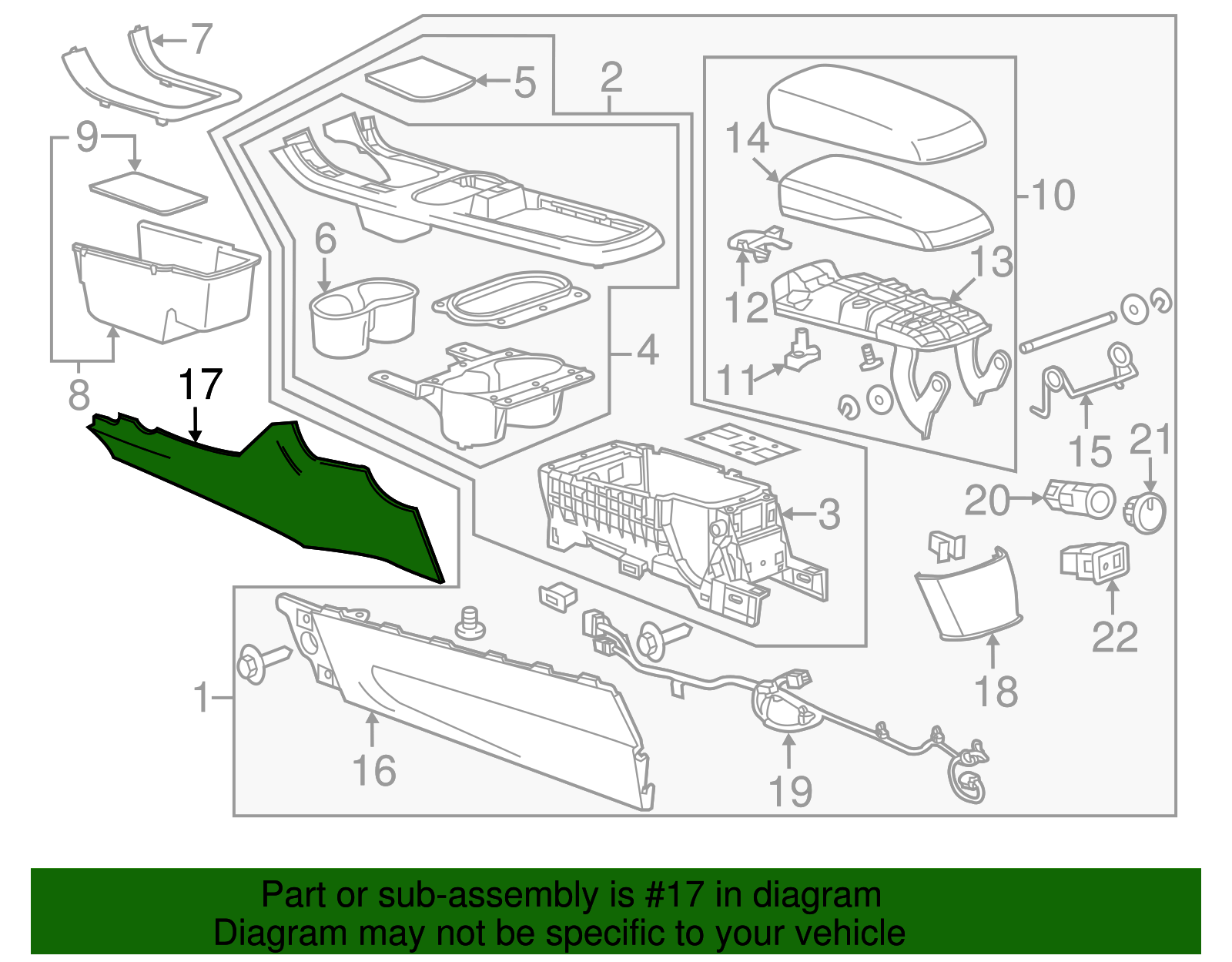 VRAY-GMC Genuine GM Jet Black Driver Side Front Floor Console Extension Panel 20836985 Part can be found as # 17 in the diagram above Product Description Console & components. Helps define the appearance of your vehicle's console This GM Genuine Part is designed, engineered, and tested to rigorous standards and is backed by General Motors Collision parts are designed to help promote proper and safe repair Specifications Brand GM Manufacturer Part Number 20836985 SKU 20836985 Product Genuine GM Jet Black Driver Side Front Floor Console Extension Panel 20836985 ONLY PART REFERENCE #17 ON THE DIAGRAM IS INCLUDED WARNING : May cause cancer and reproductive harm. See www.P65Warnings.ca.gov for more info. Terms and Conditions Thank you for shopping with us. Please find our policies below. If you have any other questions, please don't hesitate to contact us. Shipping Terms In stock orders ship within 24 hours. Weekend orders will be processed the next business day. If a part is not in stock and must be ordered from the manufacturer, it usually takes 2-3 days to arrive to us and will be promptly shipped to you. Most of the orders are shipped complete within 2-3 business days. A few of the parts ordered from the manufacturer may take up to 5-6 business days to arrive and will shipped to you immediately. Depending upon location, ground shipments usually take 2-7 days. Your order may be shipped Overnight for an additional cost. Oversized shipments will be additional; you will be contacted prior to shipping for approval. We cannot guarantee transit times for ground and oversize orders. Shipping Carrier substitutions may be made at our determination in an attempt to reduce shipping cost to the customer. We do not ship internationally. In the unlikely event that a part has been placed on backorder or discontinued, we will do our best to try and find one for you as quickly as possible. We do not ship COD orders. Return Policy Contact us to arrange for any returns. A copy of the invoice will need to be included with the return. Parts must be resaleable and in the original packaging. We cannot take back used parts. We cannot take back installed or tried parts. Electrical parts are not returnable. We do reserve the right to refuse and return any parts we find have been installed, are used or do not meet the above criteria. Return request need to be within 30 days of receipt. Cancellation Policy An order or a portion of an order may be cancelled up until the time it is shipped and no longer in our possession. Home • Newsletter Signup • Contact Us Copyright © 2025 VRAY-GMC , All rights reserved. Solution by RevolutionParts, Inc. :: Design by OCDesignsOnline