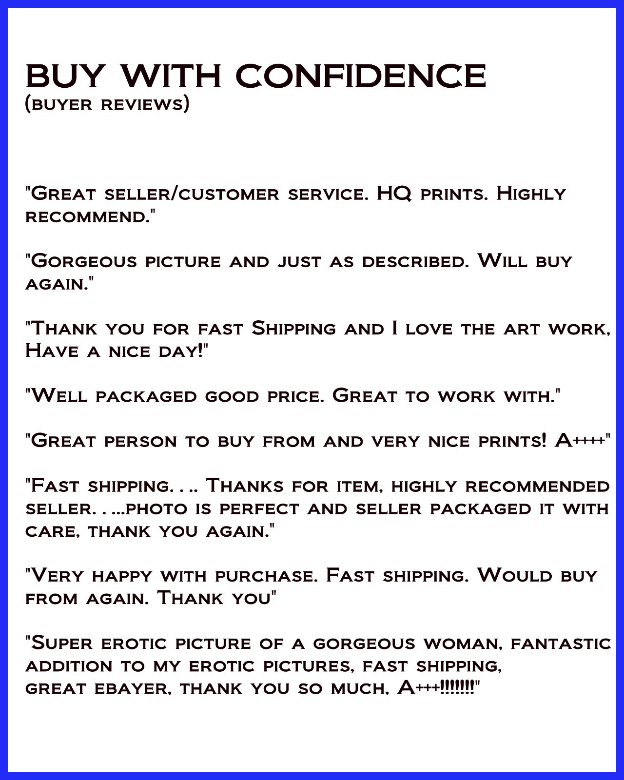 Excellent, pleased w/ purchase, fast ship--nice quality photos, beautiful Model item, great business, well packaged, reliable Seller, as described, HOT sweet item -- thank you