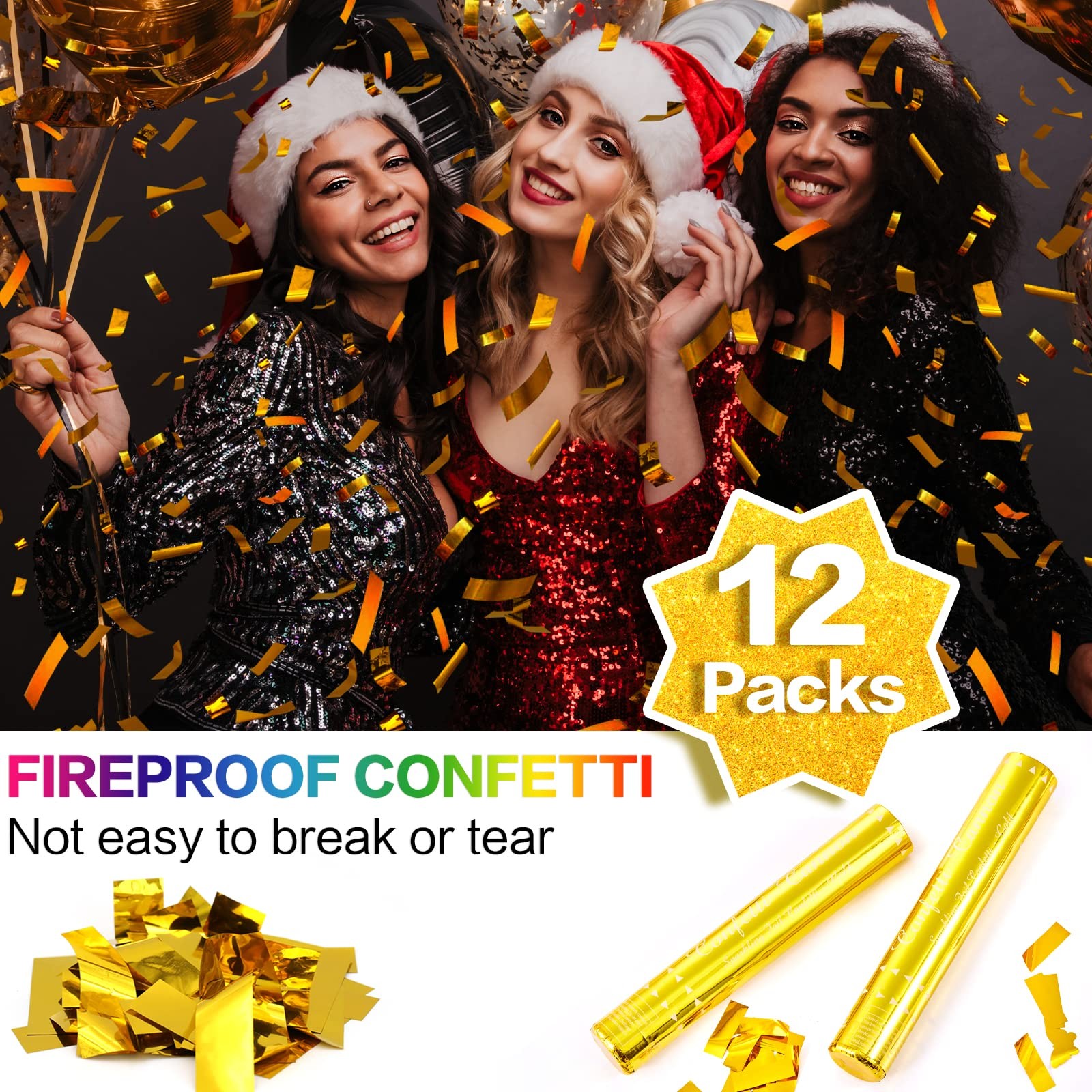Create a real spectacle with our Gold Confetti Cannons Add a burst of excitement to any party with this Confetti Cannon. Lightweight, durable, and easy to use, these fun confetti cannons release streams of gold confetti quickly, giving your event a sparkling flair that cannot be matched. 12'' poppers that shoot up to 15 feet in the air Our 12-inch streamer poppers shoot a large amount of confetti into the air at a distance of 10 to 15 feet. Add some flair to your celebration with this confetti poppers bulk and let loose an endless stream of gold paper. Perfect for celebrations, corporate events, special occasions, and more These hand-held poppers confetti shooters are perfect for weddings, college parties, birthday parties, New Year's Eve and more. Pop these confetti cannons in the middle of your next celebration and let the fun begin! Quality that you can trust We are committed to providing you with the best quality biodegradable confetti on the market. Our confetti launchers are made using top-quality raw materials, making them safe and eco-friendly. We take pride in producing the best and safest party favors, so you can go green without sacrificing fun. Package details: Unit: 12x Confetti Poppers Length: 12inches Color: Gold Gold Confetti Cannon - Create surprising, marvelous, and exciting effects with these professional party poppers. Simple twist the bottom of party poppers, the confetti poppers gives you a quick and clean release of the gold confetti, that float slowly to the ground and make any celebration complete. 12Pack Party Poppers - Our beautiful confetti poppers gold are ready to make your next event a hit! These 12 inch confetti cannon holds golden confetti and shoot 10 to 15 feet in the air. This 12pack confetti cannons gold will launch your celebration into the stratosphere! Safe To Use Confetti Poppers - Our gold confetti poppers are safe, non-toxic, and fun to pop. We use only the safest and most high-quality materials to produce our confetti cannon, so you and your guests can enjoy a wonderful party and safe to use both indoor and outdoor events. Party Confetti Cannon for Any Events - A great way to add fun, festive energy to any party or gathering. These gold confetti poppers cannon are perfect for weddings, graduation,birthday party, Christmas, family reunions, or any event where you want to up the glam factor! Service of Confetti Poppers - We're committed to giving you the best possible experience. If you're unsatisfied with our party cannon in any way, please let us know. Our customer service team will take care of all issues promptly and efficiently to make sure that you're fully satisfied. BEFORE USE CONFETTI POPPERS - Please read the instructions and tear open the packaging paper at the bottom of the popper, then easy to twist it! In order to provide you with a better experience with confetti cannon and avoid being unable to twist.
