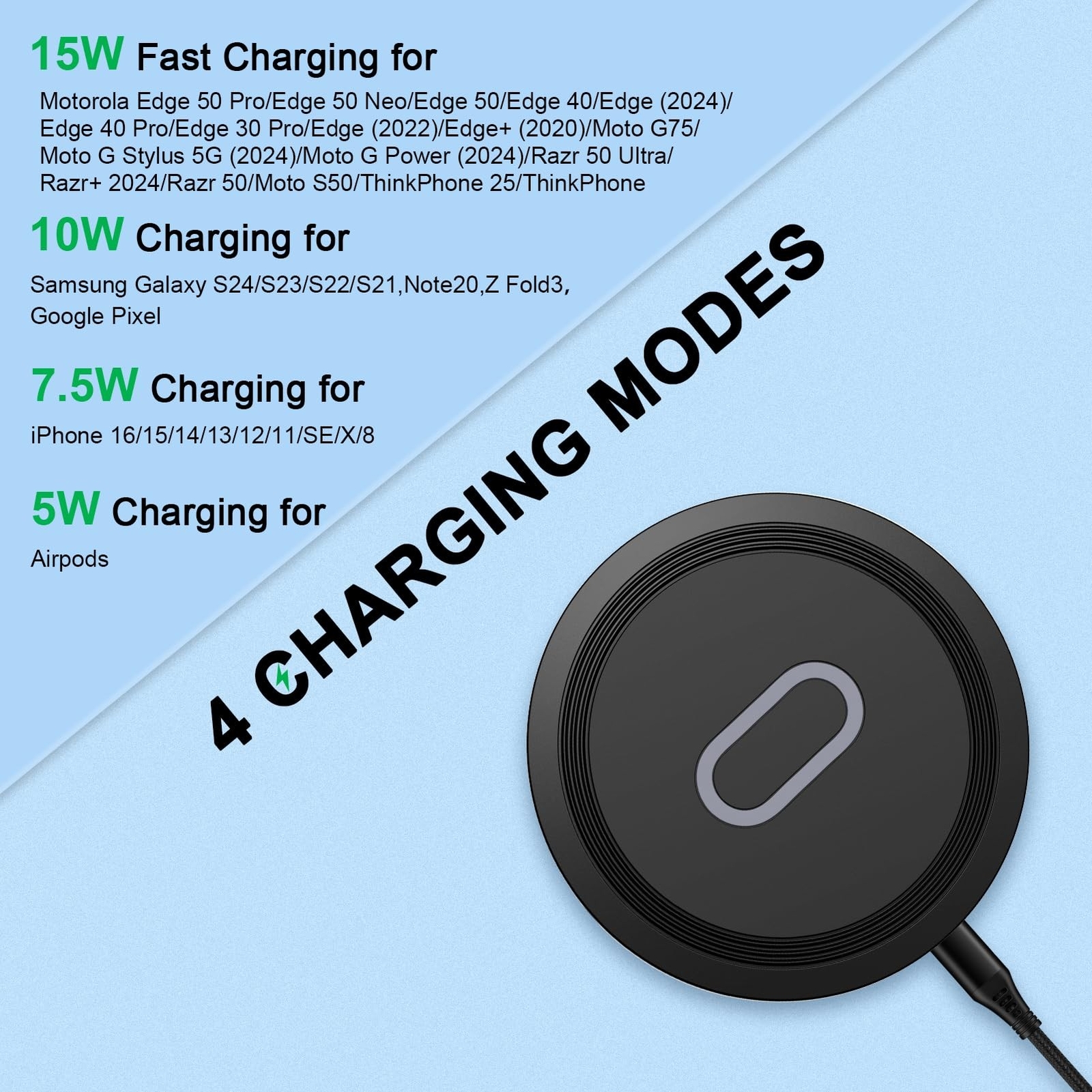 Wireless Phone Charger Google Pixel 9 Wireless Charger Pad for Google Pixel 9 Pro/9 Pro XL/9/8a/8 Pro/8,15W Wireless Charger for Android,Motorola Moto G Stylus/Moto G Power,Samsung S24 Ultra Product Details Color: Wireless Charger Pad Brand: Uenlio MPN: CWD-V01 UPC: Does not apply EAN: Does not apply Brand: Uenlio Connectivity Technology: USB Connector Type: USB Type A Compatible Devices: wireless earbuds, iPhone/Samsung Phones/Google Phones/Motorola Phones Compatible Phone Models: Google Pixel 9/9 Pro/9 Pro XL/9 Pro Fold/8a/8 Pro/8/7 Pro/7,Motorola Edge 50 Neo/ Edge 50/ Edge (2024)/ Edge (2023)/ Edge 40/ Edge+ (2023)/ Edge 40 Pro/ Edge (2022)/ Edge+ 5G UW (2022)/ Edge 30 Pro/Razr+ 2024/ Razr 50 Ultra/ Razr 2024/ Razr 50/Moto G75/ Moto S50/ Moto G Stylus 5G (2024)/ Moto G Power (2024)/ThinkPhone 25/ Defy 2/ ThinkPhone/ Moto X40, iphone 16 Pro Max/16 Pro/16 Plus/16,iPhone 15 Pro Max/15 Pro/15 Plus/15,iPhone 14/14 Pro/14 Pro Max/14 Plus,iPhone 13/13 Pro/13 Pro Max/13 Mini,iPhone 12/12 Pro/12 Pro Max/12 Mini,iPhone 11/11 Pro/11 Pro Max,iPhone X/XS/XR/XS MAX, iPhone 8/8 Plus, Samsung Galaxy Z Flip5,Z Fold5,Samsung Galaxy S24/S24+/S24 Ultra, S23/S23+/S23 Ultra, S22/S22+/S22 Ultra, S21/S21 FE/S21+/S21 Ultra,S20/S20 FE/S20+/S20 Ultra, Note 20/Note 20 Ultra/Note 20+,Samsung Galaxy S10/S10e/S10+/S9/S9+/S8/S8+/S7/S7 edge/S6/S6 edge,Samsung Galaxy Note 10/Note 10+/Note 9/Note 8/Note 7,Galaxy Z Fold3p See more Included Components: Wireless Charging Pad, USB A charging cable-Black Special Feature: wireless charger, Lightweight Design, Fast Charging Color: Wireless Charger Pad Input Voltage: 12 Volts Mounting Type: Tabletop Mount Product Dimensions: 0.79 x 0.39 x 0.39 inches Item Weight: 0.176 ounces Item model number: CWD-V01 Connectivity technologies: USB Special features: wireless charger, Lightweight Design, Fast Charging Other display features: CE Form Factor: Round Pad Color: Wireless Charger Pad Whats in the box: Wireless Charging Pad, USB A charging cable-Black Manufacturer: Shenzhen Chuang Wei Da Technology Co., LTD Country of Origin: China Date First Available: April 10, 2024 4 Charging Mode Wireless Charger: Optimized chipset provides 15W charging on Motorola Edge 50 Pro/Edge 50 Neo/Edge 50/Edge 40/Moto G Stylus 5G (2024)/Moto G Power (2024)/Razr 50 Ultra/Razr+ 2024,10W charging on Samsung Galaxy S24/S23/S22/S21/S20,Note 20,Google Pixel 9/9 Pro/9 Pro XL/9 Pro Fold/8a/8 Pro/8,7.5W charging on iPhone 16/15/14/13/12,and 5W charging on AirPods.The USB adapter is not included.It is recommended to charge at 15W/10W/7.5W using a QC 3.0/PD 3.0 charger block (9V/2A) Safe to Use: Fast wireless charger prevents short circuits, overheating, overcurrent, and overcharging, guaranteeing that your smartphone charges safely Sleep-Friendly LED Indicator: Avoid the stress of hunting for multiple charging cords! To use this wireless charger pad, simply connect it to a power adapter and lay your phone on it. When the wireless phone charger lights up, it indicates that your device has been correctly identified and charged. Quiet LED display status allows for uninterrupted sleep with no notification sounds What You Get: You will get cordless wireless charger pad x1 , USB-C charging cable x1. Together with our24hrs/7d friendly customer service.Note: USB Adapter NOT included