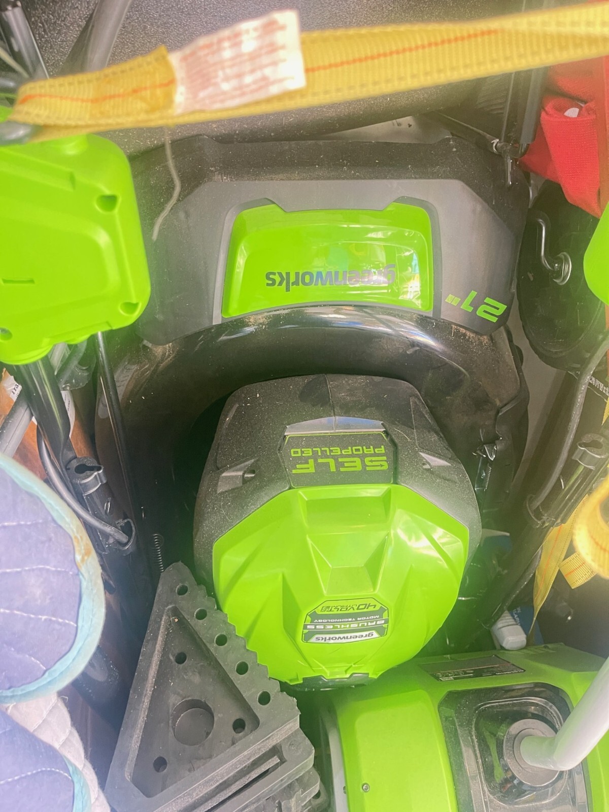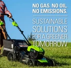 Greenworks 40V 21" Brushless Cordless (Self-Propelled) Lawn Mower (75+ Compatible Tools), 5.0Ah Battery and Charger Included Brand Greenworks Power Source Battery Powered Material Alloy Steel Color Lmf403 Style Mower Item Weight 21.7 Pounds Cutting Width 21 Inches Number of Positions 5, 7 Operation Mode Automatic Product Dimensions 65.35"D x 21.65"W x 33.07"H See more About this item 40V 21” LAWN MOWER - Get more done, faster, with Greenworks electric lawn mowers. This 40V self-propelled lawn mower provides up to 45 minutes of run-time with fully charged 5.0Ah battery (varies based on grass condition and operator technique).Front wheels : 8 Inches BRUSHLESS MOTOR / DURABLE STEEL DECK - This electric mower features a durable 21" deck, and a highly efficient brushless motor that provides more torque, quiet operation, and longer life SINGLE LEVER HEIGHT ADJUST - 7 position height adjustment provides the best cut in all environments. 3-in-1 design offers rear bag, side discharge, and mulching capabilities SELF-PROPELLED - Rear wheel drive power increases traction to tackle the toughest backyard terrain VERTICAL STORAGE - Save 70% more space with vertical storage MAINTENANCE FREE - The walk behind lawn mower is virtually maintenance free, with no gas, no oil, and no emissions. It starts instantly, is quiet, and delivers the power you need