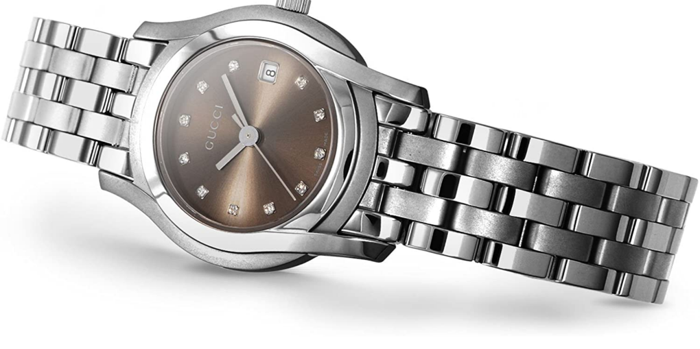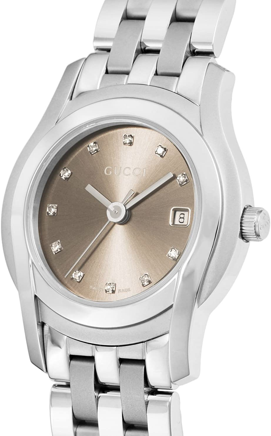 Gucci G-Class Women’s Brown Dial Stainless Steel Watch – YA055523 ($1320 MSRP) With Original Box! This watch is a Shelf Pull from one of the Major Department Stores. Watch has micro scratches on the watch case/band, visible under direct light. Exude timeless sophistication with the **Gucci G-Class Women’s Brown Dial Stainless Steel Watch – YA055523**, a refined accessory from the esteemed Gucci 5500 collection. Designed for the woman who values classic elegance, this Swiss-made timepiece boasts a rich brown dial set within a polished and brushed stainless steel round case. Delicately sized with a 27 mm case width and a slender 7 mm depth, this watch ensures a graceful fit on the wrist, making it ideal for both everyday wear and special occasions. Functionality meets finesse with the inclusion of a three-hand analog display and a practical date window positioned at 3 o'clock. Protected by a durable mineral crystal, the dial is adorned with subtle gem-accented hour markers, enhancing its luxurious appeal without overpowering its understated design. The silver-tone stainless steel bracelet—measuring 7.5 inches in length and 14 mm in width—features a polished and brushed finish, complemented by a secure double folding clasp with push button for comfortable, reliable wear. Powered by a Swiss quartz movement, the Gucci G-Class YA055523 promises precision and reliability. With a water resistance of up to 30 meters (100 feet), it can withstand splashes and brief immersion, adding practicality to its sophisticated profile. Whether worn as a standalone statement or paired with other jewelry, this watch captures Gucci’s signature blend of luxury, craftsmanship, and enduring style. Features Stainless steel case with a stainless steel bracelet. Dial color : brown. Fixed stainless steel bezel. Dial Type: analog. Date display at the 4 o'clock position. Quartz movement. Case diameter: 27 mm. Case thickness: 7 mm. Water resistant at 30 meters / 100 feet. Functions: hours, minutes, seconds, date. Fast and Free Shipping You're already purchasing the item. Why pay additional for shipping, especially slow shipping? We get your order shipped out within 1-business day and delivered to your doorstep as quickly as possible. Competitive Pricing With our dynamic pricing model, our prices are always competitive. Our prices are some of the lowest that you will find on the internet. Rest assured that you're getting a good deal when purchasing with us. 30-day Money Back Guarantee We are committed to making sure that you leave this transaction satisfied. If you're unhappy with the product for any reason, you may return it back for your money-back or a replacement within 30 days. No questions asked!