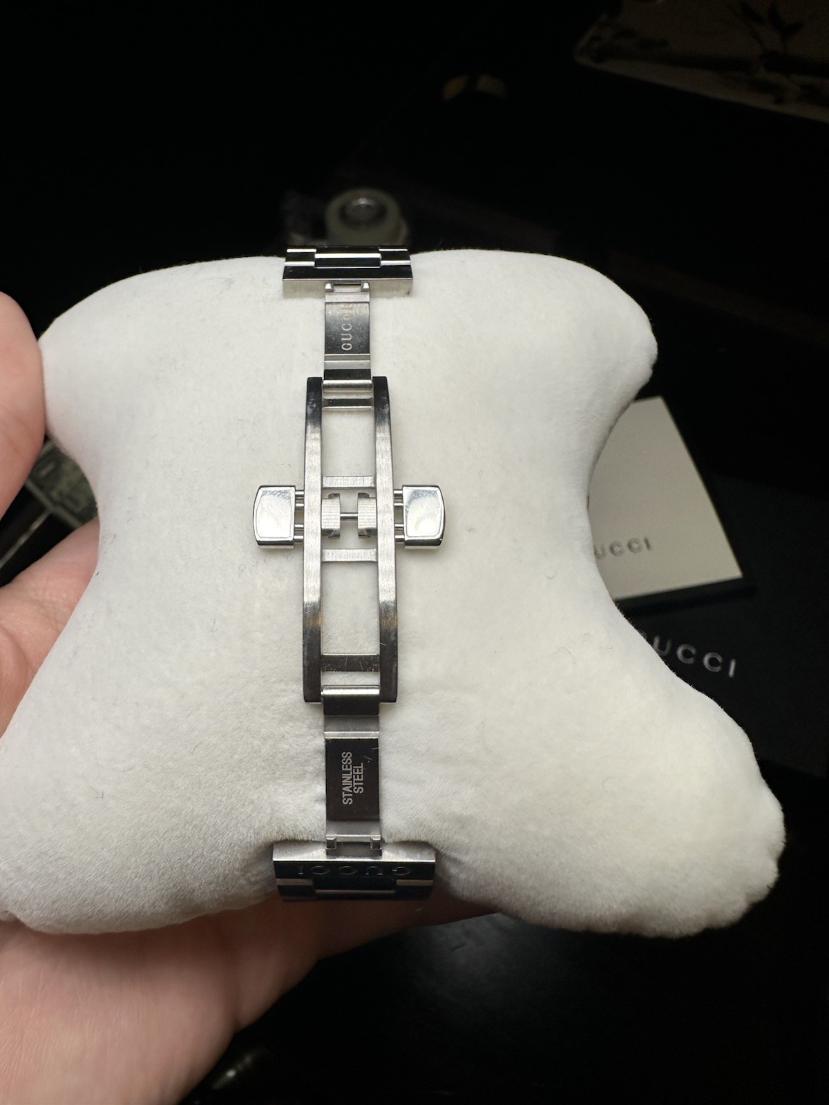Gucci G-Timeless YA126459 quartz wristwatch in excellent condition. Features a stainless steel band, silver patterned dial with signature logo on hand and date display. Comes with original box and papers. Lightly worn, fully functional. Unisex design with classic Gucci styling—perfect for everyday wear or collection. $1050 MSRP. Please see "condition" section for more information.
