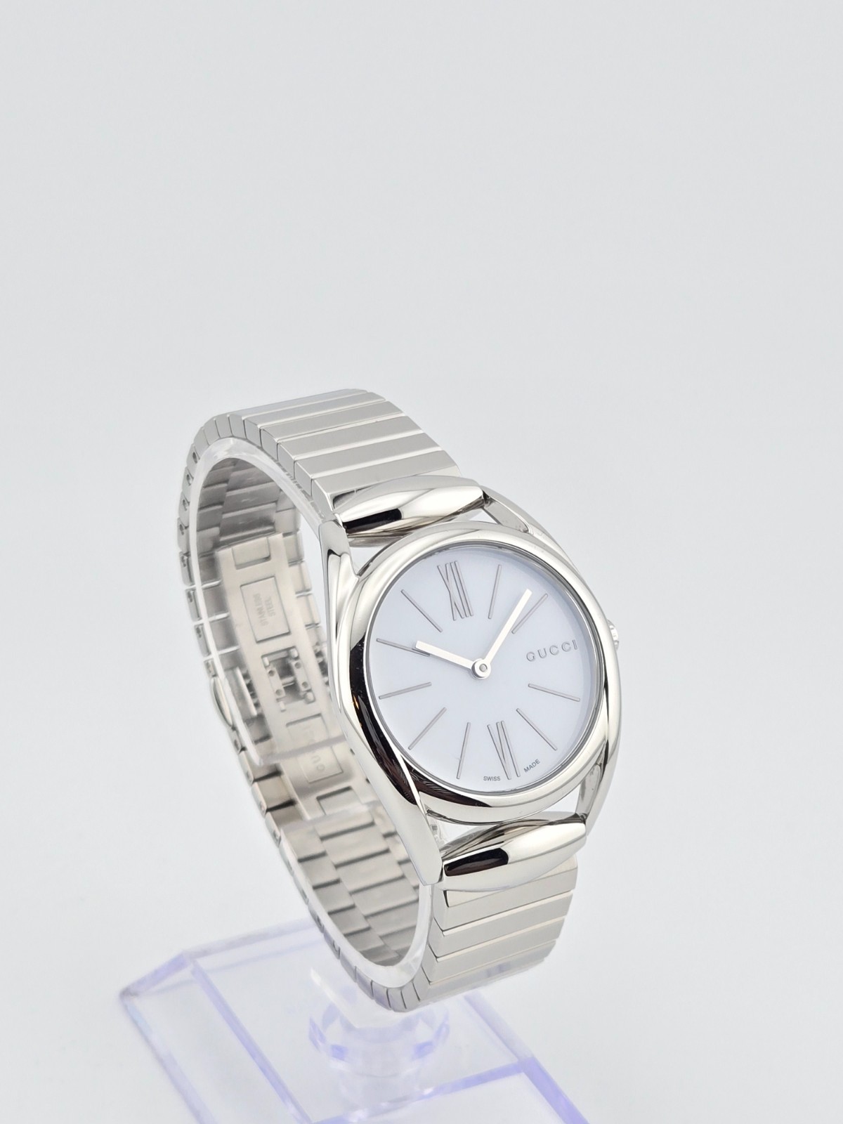 Gucci Horsebit Women's White Dial Roman Numerals Watch - YA140505 ($920 MSRP) With Original Box! This watch is a Shelf Pull from one of the Major Department Stores. Watch has micro scratches on the watch case/band, visible under direct light. The Gucci Horsebit Women's White Dial Roman Numerals Watch - YA140505 is a sophisticated and elegant timepiece designed for women who appreciate both style and functionality. This watch features a sleek stainless steel case and bracelet, providing durability and a refined look that complements any outfit. The fixed stainless steel bezel frames a pristine white dial, which is enhanced by silver-tone hands and index hour markers. Roman numerals at the 6 and 12 o'clock positions add a touch of classic elegance to the modern design. The analog dial type ensures easy readability and timeless appeal. Powered by a reliable quartz movement, the Gucci Horsebit watch offers precise timekeeping. The scratch-resistant sapphire crystal protects the dial from everyday wear and tear, maintaining its clear and polished appearance. The pull/push crown allows for easy time adjustment, while the solid case back adds an extra layer of protection to the movement. With a case diameter of 30 mm, this round watch fits comfortably on the wrist. The deployment clasp with a push-button release ensures a secure and convenient closure. Water-resistant up to 50 meters (165 feet), this watch is suitable for short periods of recreational swimming but not for diving or snorkeling. The Gucci Horsebit Women's White Dial Roman Numerals Watch - YA140505 is perfect for those who value elegance and functionality. Its stainless steel construction and classic design make it a versatile accessory for any occasion, while the precise quartz movement and durable materials ensure it will be a reliable timepiece for years to come. Whether for everyday wear or special occasions, this watch is a stylish and practical addition to any wardrobe. Features Stainless steel case with a stainless steel bracelet. Fixed stainless steel bezel. White dial with silver-tone hands and index hour markers. Roman numerals mark the 6 and 12 o'clock positions. Dial Type: Analog. Quartz movement. Scratch resistant sapphire crystal. Pull / push crown. Solid case back. Case diameter: 30 mm. Round case shape. Deployment clasp with push button release. Water resistant at 50 meters / 165 feet. Functions: hour, minute Fast and Free Shipping You're already purchasing the item. Why pay additional for shipping, especially slow shipping? We get your order shipped out within 1-business day and delivered to your doorstep as quickly as possible. Competitive Pricing With our dynamic pricing model, our prices are always competitive. Our prices are some of the lowest that you will find on the internet. Rest assured that you're getting a good deal when purchasing with us. 30-day Money Back Guarantee We are committed to making sure that you leave this transaction satisfied. If you're unhappy with the product for any reason, you may return it back for your money-back or a replacement within 30 days. No questions asked!