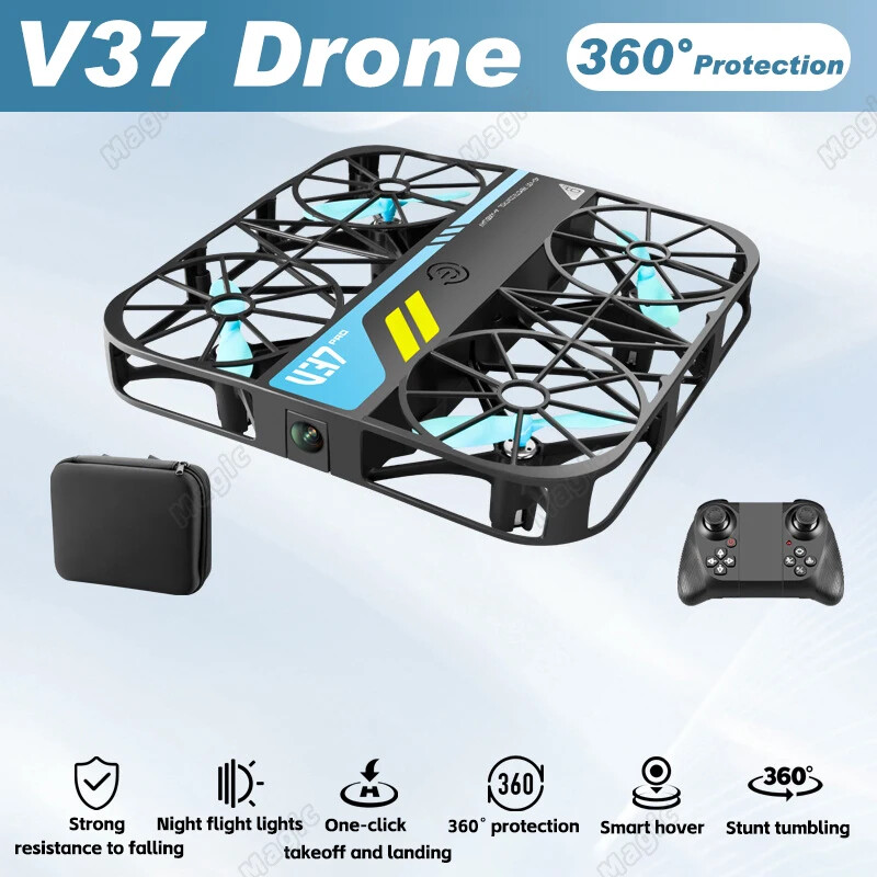 Specifications: Item name: V37 Mini RC Drone with All-Round Protetive GuardThe Christmas and New Year Birthday gifts for Children Remote controller: 2.4G 4CH Color: Black Product size: 11 * 11* 4cm Control distance: About 100m Flying time: about 8-10 mins Charging time: About 60mins Camera: NO camera,4K,8K 4k camera :images: 4k 4096×2160 video 1080P 2048×1080 8k camera : images: 8k 7680×4320 Video 1080P 2048×1080 Drone battery: 3.7V 400mAh lipo battery (built-in) Functions: Sideward flight, turn left/right, up/down, forward/backward, altitude hold, one key take off/landing, 3D flip, WiFi FPV, Speed Control, headless mode Features: - With altitude hold mode function, flight is stable. - In headless mode, there is no need to adjust the position of the aircraft before flying. - Easily find your way home using the one-button back function. - Built-in 4K pixelHD/8K pixelHD camera. Surprisingly, it can capture pictures and videos from the sky. - With WiFi function, it can be connected to applications, APK system, and take photos, videos, and real-time transmission through mobile phone camera images. -Safe Design : The protective full-cover protect the drone propellers from the collision and greatly help avoid injury. Super useful and durable in flights. - 2.4GHz anti-interference technology. - 4 channels for ascent, descent, forward, backward, left flight, right flight and 360 Ì» roll. Package Included: 1 * V37 RC Drone(Pls make sure the versions which you choose ,we have No camera/4K/8K) 1 * Remote Controller 1 * USB charger 2 * Spare Propellers 1 * User Manual