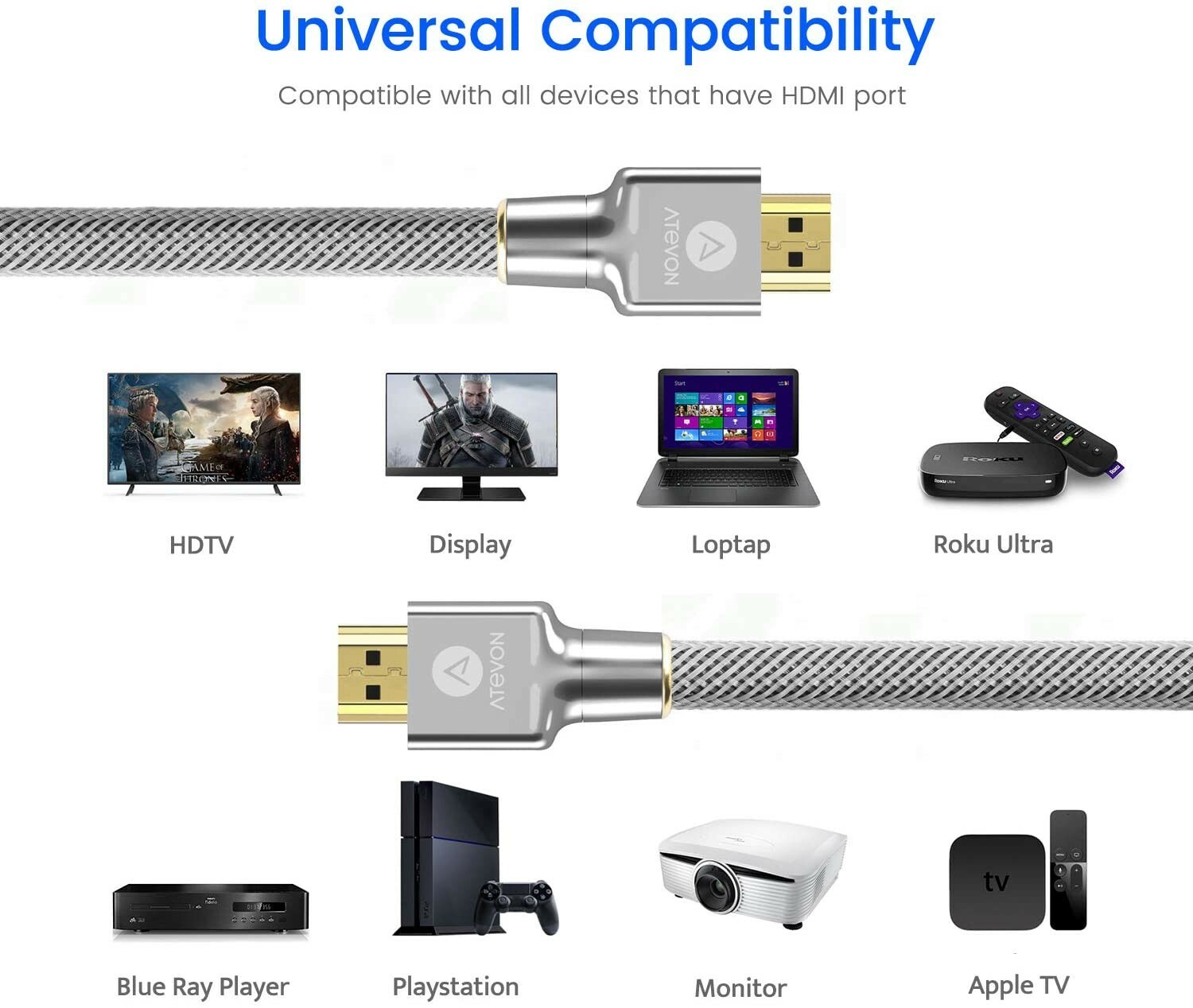 HDMI Cable 3 ft– 4K High Speed 18Gbps HDMI 2.0 Cable – 4K HDR, 3D, 2160P, 1080P, Ethernet–28AWG Braided HDMI Cord – Audio Return(ARC) Compatible UHD, PC, Fire TV, Sliver Atevon High-Speed HDMI Cable (4K@60Hz) Durable, Flexible and Stylish High-Definition Video and Audio This cable utilizes the latest HDMI standards that support bandwidth up to 18Gbps to achieve the highest transmission rate, capable of 4K Ultra-HD resolutions. Up to 2K@144Hz, 2160p@60Hz, HDCP 2.2 support, HDR, 48-bit Deep Color, 3D, 32 audio channels, Dolby 7.1, 21:9 video aspect ratio, Multi-stream audio and video on this cable. Ethernet & Audio Return Channel Ethernet & Audio Return channels eliminate extra network and audio cables. Fewer cables mean slimmer cable management box! With the Atevon High-Speed HDMI Cable, enjoy reliable performance and superior playback. Outstanding & Unique Design Features Pure copper and gold plated connectors for resist corrosion, provide durability and improve the signal transmission. 100% pure oxygen-free bare copper wiring(28AWG) enable 18Gbps speed required for all HDMI 2.0b features. Copper-Foil wrapped in Zinc-Alloy Shell to achieve better shielding and even lower SNR. Nylon jacket and Zinc-Alloy casing add both color and durability. High-quality Transmission Supports bandwidth up to 18Gbps to achieve the highest transmission rate, capable of 4K resolutions. Gold-plated connectors and triple shielding protect against outside interference, so it not only can provide High-quality sound and picture, but also quality maintain the integrity and purity of the digital signal. Male to A Male Notice: Not compatible with Go Pro, Smart Phones, Tablets and Cameras. Compatible with all devices having an HDMI Port (Type A) Atevon 6 ft HDMI cable is the perfect length to connect your laptop or streaming device to your Ultra HD High Speed HDMI set up. High-Resolution Pictures and Deeper Colors Ultra HD 4K 2160p (up to 60 Hz 4:4:4) HD 2K 1080p (up to 240 Hz) 3D Format QHD 1440p (up to 144 Hz) 4K HDR