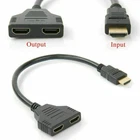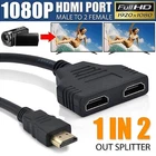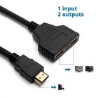 HDMI Splitter Cable Male 1080P to Dual HDMI Female 1 to 2 Way HDMI Splitter Adapter Cable for HDTV HD, LED, LCD, TV, Support Two TVs at The Same Time About this item Function: This product can operate as a signal router,you may have a TV in two separate rooms,you can have a TV on in one room and when you want to switch room and keep watching the TV,you just need to switch one TV off and switch the other TV on,and then the signal is routed to the TV in the other room. Feature: It takes a signal from one device such as a Bluray player and will direct to one of two output devices that are plugged into it. This HDMI splitter cable is great for connecting one HDMI compatible device (Xbox,Blueray,DVD players,for PS3) to two visual output devises. Suitable for:High Definition image resolutions such as 720p,1080i,and 1080p. Package Include: 1 x HDMI Cable. Length: 11.8 inch (30 cm). Note:ONLY 1 output device should be active at any time. UNLESS both TVs are of the same size,then both TV will show the images when connected.