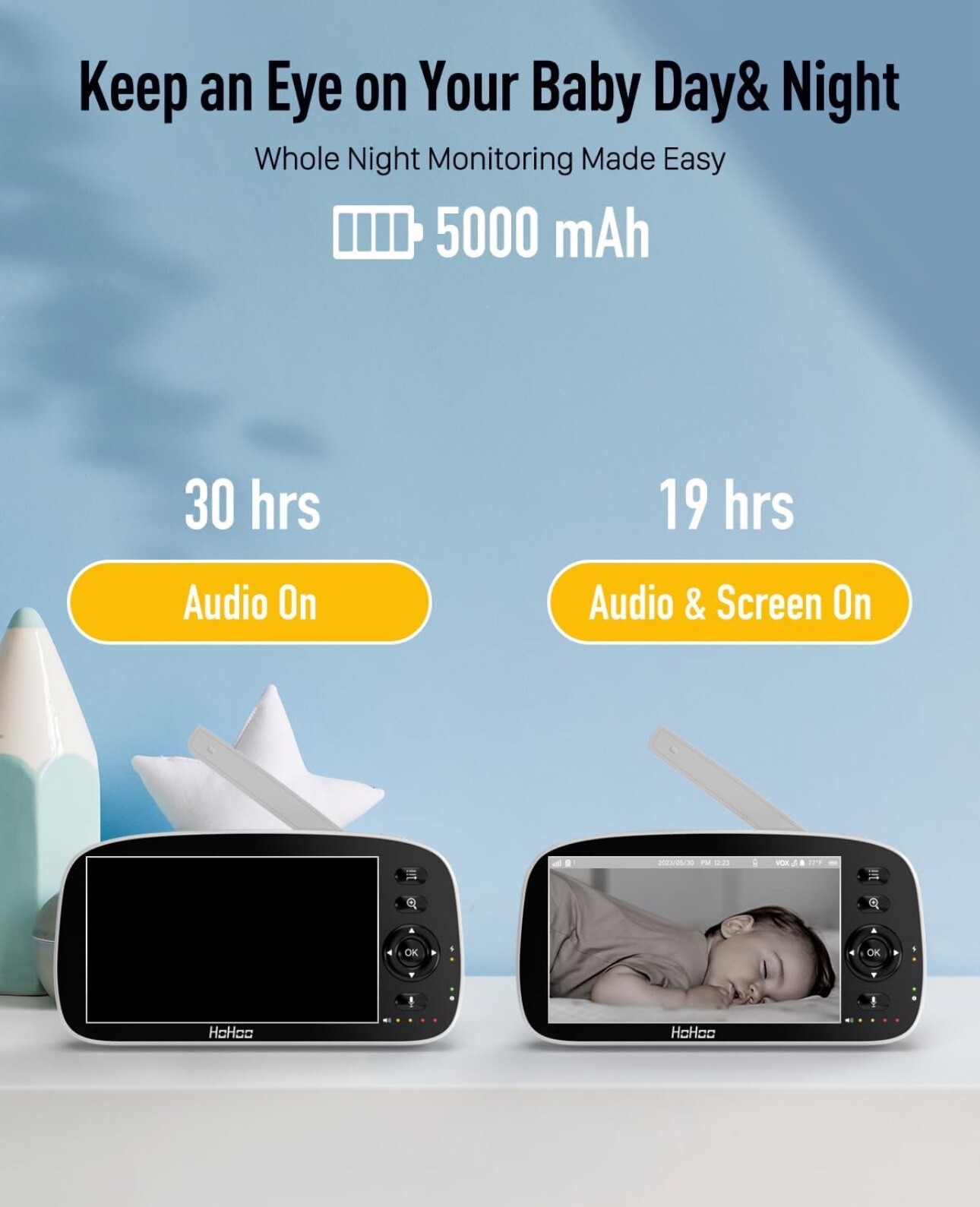 đ„HoHoo Baby Monitor 5" 720P HD Split Screen 30 Hours Battery Life Baby Monitor Baby Monitor, 5" 720P HD Split Screen, 30 Hours Battery Life Baby Monitor with Camera and Audio|Remote PTZ, Two-Way Audio, Zoom, Night Vision, Lullabies, 960ft Long Range Top highlights Recommended Uses For Product - Indoor Security Brand - HOHOO Connectivity Technology - Wireless Special Feature - Noise Reduction Indoor/Outdoor Usage - Indoor Compatible Devices - baby camera ăNo Worries From Day to NightăïŒThis HoHoo baby monitor camera equipped with 5000mAh rechargeable battery you can get up to 19 hours of video streaming or up to 30 Hrs of Audio only streaming, allowing you to easily monitor your baby throughout the night or full day on one charge. ăNo Detail Is Sparedă:The large 5'' 720p resolution color screen coupled with sharp pictures with 10x details and an enlarged screen with 2x display area than ordinary 3.5'' 480p LCD baby monitors.Improved LCD screen offers more brightness, better viewing angles, and sharper colors. The video baby monitor can also help you capture all corners with PTZ function - Pan 355°, Tilt 115.The baby camera monitor with 2x to 4x zoom capability helps you see your baby up close. ăSoothe & Comfort Your Babyă: Create and monitor a comfortable and pleasant environment for the baby with right temperature and natural sounds/lullabies to soothe the senses. The temperature sensor alerts you to adjust the thermostat when required as per your settings. Use the two-way audio and the programmed lullaby sounds to calm your baby remotely. Watch your love in the nursery 24/7, thanks to the IR night vision of this high-end portable baby monitor with camera and audio. ăInvest in Your Peace of MindăïŒ To make yourself rest while the baby sleeps you can turn off the monitor's screen and mute the sound too. Be rest assured that while it is off, it is still monitoring the baby in the background. When it picks up any sound over your VOX settings, the screen will automatically turn back on. The 4-level color indicator on the parent unit can let you visually alerted when baby is crying. ăBaby Essentials Must HavesăïŒThe 2.4GHz FHSS wireless connection ensures a secure and private live stream that is only for you. Protect you and your family from privacy leakage, especially when going out. No WiFi, No app downloading or account creation required. Easy to set up, plug in and use. With up to 960 feet of range, you can go about your day and stay connected with your baby from another room or even from the yard