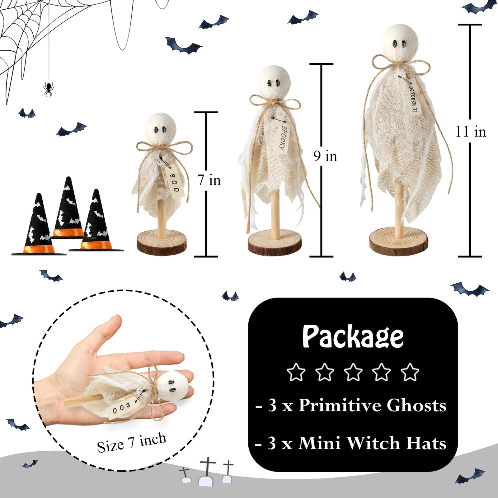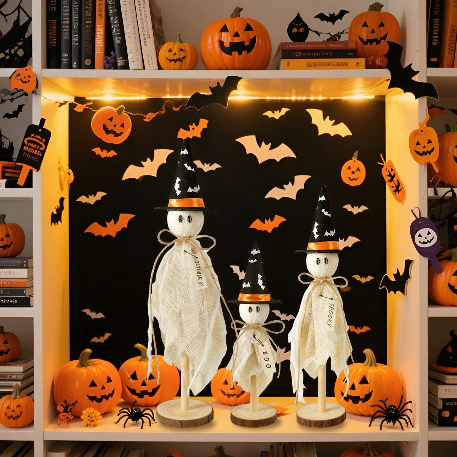 Halloween Decorations Indoor, 3 PCS Primitive Halloween Ghosts on Wooden Stand Halloween Table Decor Table Centerpieces, Tiered Tray Decor, Shelves Mantels. Nice Halloween decor to adorn your Halloween party table. Place these spooky Halloween table decor to making this Halloween atmosphere more intense. keywords: halloween decorations, Halloween ghost, halloween decor, halloween decorations indoor, halloween table decorations, halloween table decor, Halloween ghosts, indoor halloween decorations, halloween party decorations, halloween centerpieces for tables, ghost decor, ghost decorations, halloween home decor, halloween indoor decorations, halloween decor indoor, halloween mantel decor, ghosts halloween decorations with witch hat hats [UPGRADE DESIGNS] Adorable set of 3 primitive wooden ghost shelf sitters with mini witch hats. Adding witch hats with bat stickers creates a more Halloween atmosphere. Come and see - these Halloween table decorations are so cute. What' s a Halloweentown FESTIVE without these adorable Halloween decorations clearance? [MATERIAL & SIZE] The Halloween decorations indoor set is made of high-quality wood & fabric. These Halloween ghosts stand approximately 10.6", 8.6", and 6.7" tall. Also, the cute witch hats are suitable size for table ghosts, not easy to fall off. Versatile and charming, these Halloween decorations work beautifully as bowl fillers or standing displays for tables, shelves, mantles, tiered trays, and more. [FESTIVE ATMOSPHERE] These cute Halloween ghosts all have a rustic tag, saying "BOO", "OCTOBER 31" and "SPOOKY". Nice Halloween decor to adorn your Halloween party table. Also each wears a witch hat with bat stickers.Place these spooky Halloween table decor to making this Halloween atmosphere more intense. [CUTE & GIFT] Boo-tiful Halloween gift for everyone! These adorably spooky primitive Halloween ghosts with witch hats are a total crowd-pleaser! 3 cute-designed Halloween decorations with chunky, friendly shapes - great for kids' rooms, party favors and festive fall decor. [NOTE] Each of these 3 Primitive Halloween Ghosts is lovingly handcrafted - no two spirits are ever quite alike. Their charming imperfections whisper tales of artisanal magic, making every ghost a singular treasure in your Halloween collection.