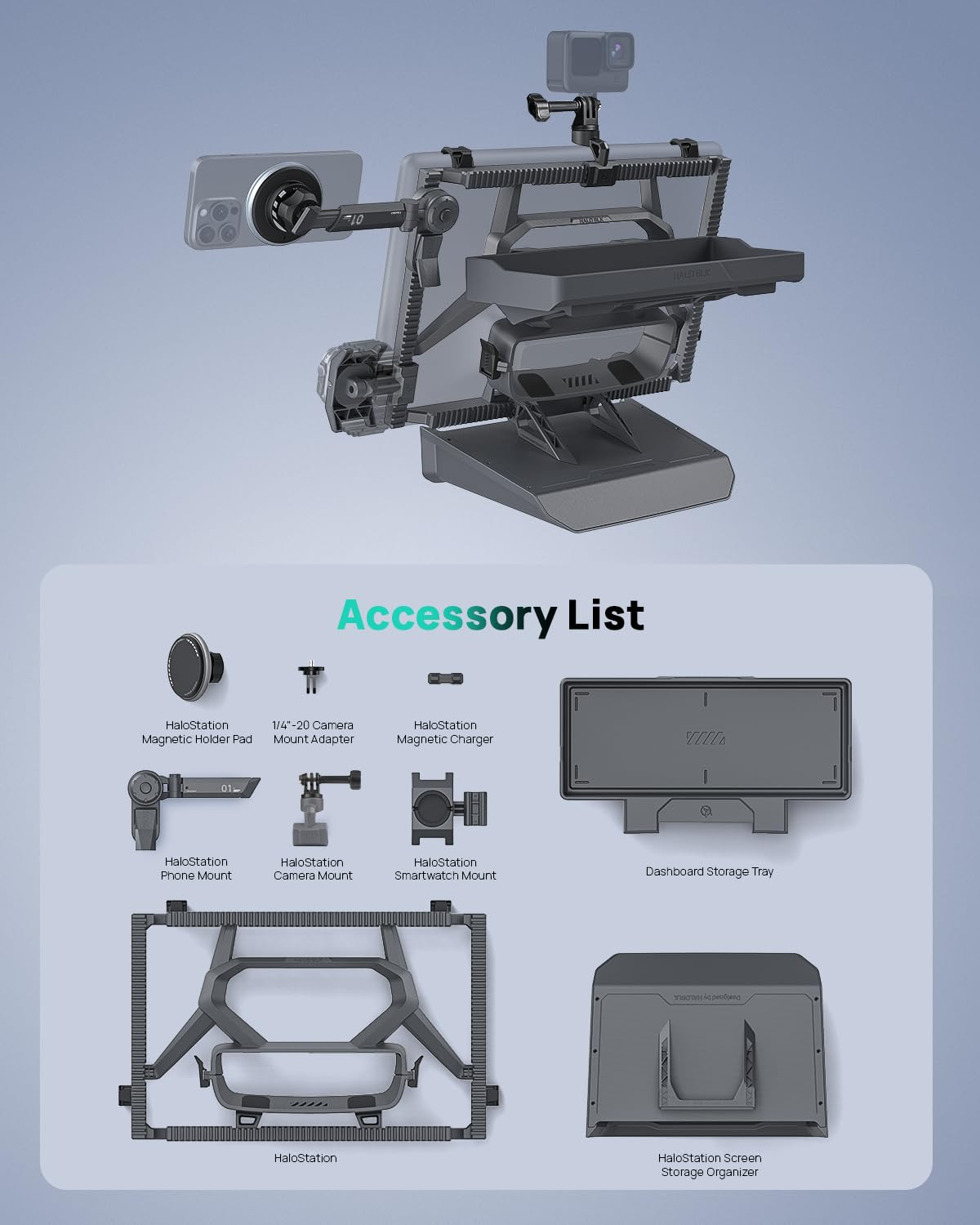 The primary purpose behind the design of HaloStation is to offer drivers a practical and versatile driving screen solution. It provides ample storage space while freeing up the driver's hands, ensuring a safe and organized driving experience Based on the Picatinny rail, the HaloStation allows users to flexibly achieve the separate and non-interfering use of a phone holder, camera mount, smartwatch stand, and storage organizer in any position on the screen Versatile Phone Mount: Equipped with 3 adjustable buttons and one telescopic arm, it can meet various usage angles Expanded Storage Space: Comes with 1 x sliding screen storage organizer and 1 x silicone dashboard storage tray. The silicone pad inside the storage organizer prevents item movement and noise, while the portable glasses holder at the bottom ensures organized and quiet storage Explore more possibilities: We have open-sourced the data for the Picatinny rail of HaloStation, allowing users to start their own DIY projects, including creating iPad mini mounts, radar detectors, collectible figurines, aromatherapy holders, AirPod charging mounts, and more