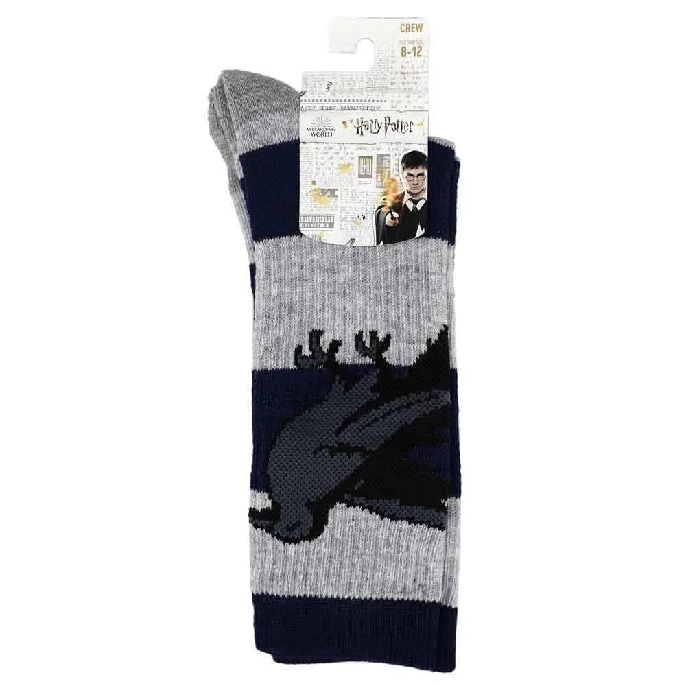 Harry Potter - Ravenclaw Rugby Stripe Crew Socks - Bioworld Condition: New Show your Ravenclaw pride with the Harry Potter - Ravenclaw Rugby Stripe Crew Socks by Bioworld. These elegant socks feature the iconic blue and silver stripes of the Ravenclaw house, making them a sophisticated accessory for fans of the wizarding world. Perfect for showcasing your intellectual and creative spirit, they add a magical touch to your wardrobe whether you're at home, work, or a fan event. Crafted from a premium blend of 98% polyester and 2% spandex, these socks are designed for comfort and durability. The deep heel and toe pockets ensure a secure, snug fit, while the cushioned footbed and arch compression provide excellent support for all-day wear. Sized to fit sock size 10-13 and shoe size 8-12, they cater to a wide range of fans, offering both practicality and style. Caring for these socks is effortless—simply machine wash cold with like colors, avoid bleach, and tumble dry on low heat to keep them in top condition. Imported and made with high standards, these Ravenclaw crew socks are a must-have for fans who want to display their house loyalty while enjoying maximum comfort. Whether you're gifting them to a fellow fan or treating yourself, they are a perfect blend of function and fandom.