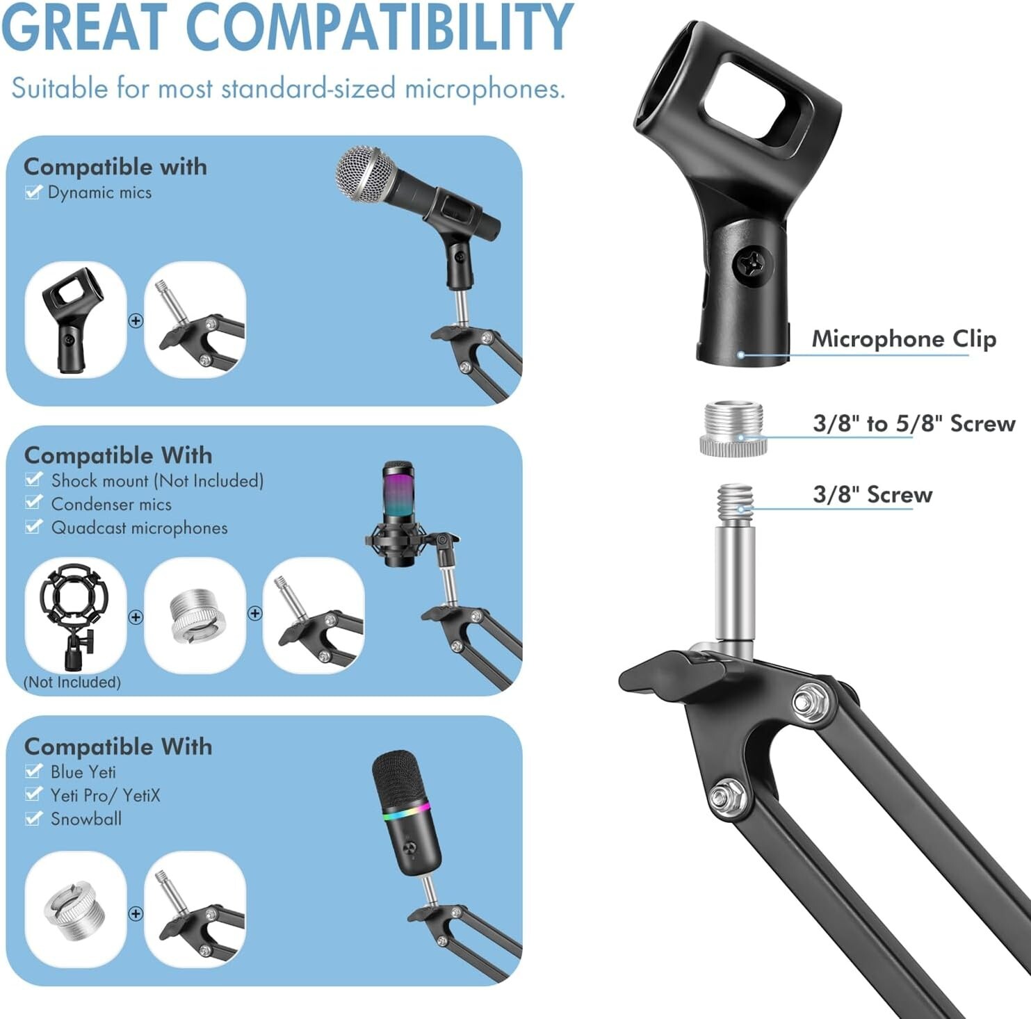 Microphone Boom Arm, Heavy Duty Boom Arm Mic Stand Suspension Scissor Mic Arm... Discription Professional Mic Arm Set: Package includes all the items you need for studio recording and live sound: 1 X Microphone boom arm; 1X Table Mounting Clamp; 1 X Mic Clip; 1 X 3/8" to 5/8" Screw Adapter; 3 X Cable Ties. Enjoy your recording, podcasting, gaming and live broadcast. Solid & Heavy Duty: Compared with other mic arms(Max bearing capacity: 2.2lbs/1.0kg), LacBec professional desk microphone stand features high quality steel material with super-strong springs, which ensures an excellent load-bearing capacity of Approx. 3.08lb/1.4kg. No shaking, very stable! Fully Adjustable: This professional mic arm is fully adjustable in all parts with 360°base rotation for 135° back and forth extension, 180° arm shaft for up-and-down movement, and 270° metal adapter to freely position microphones. You can easily adjust the mic to the suitable angle or height to record your voice! It can be easily folded, which makes it space saving when you don't use it. Upgraded Table Clamp: The clamp base of LacBec suspension boom arm can easily clip at most 2.08"/5.2cm thick desk. The two sides of clamp base is upgraded with the quality silicone pad, which makes it anti-slip and extra stable, and protect your desk from any scratches when you swivel side screw.