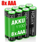 HiQuick AAA Rechargeable Batteries AAA Batteries 1100mAh High Capacity Performance 1.2V, Per-Charged Ni-MH AAA Battery Pack of 8 Batteries About this item HiQuick 8 packs 1.2V AAA 1100mAh Ni-MH rechargeable batteries. HiQuick AAA batteries, can be recharged for 1200 times when fully or partially drained, save money and protect environment. Low self discharge, HiQuick AAA batteries maintain 80% of capacity after 36 months of non-use. HiQuick AAA batteries can be used anywhere and can replace conventional batteries in all devices, ideal for solar lights,digital cameras, toys, remote controls, hand held games, 2-way radios, PDAs, flashlights, alarm-clocks, LCD-TVs, toothbrushes, shavers and portable audio players etc. Pre-Charge, HiQuick aaa battery is pre-charged with 20%-30% power, and you can use it immediately when you get the battery. Product Description HiQuick AAA Rechargeable Batteries AAA Batteries 1100mAh High Capacity Performance 1.2V, Per-Charged Ni-MH AAA Battery Pack of 8 About HiQuick Q.Who is HiQuick? A:HiQuick is one of the leading battery and charger manufacturing companies that are engaged in AA, AAA, C, D, 9Vbatteries and related battery chargers, it has more than 20 years of battery R & D and production history. Q.How about the Qualification ? A:HiQuick rechargeable batteries, are sold in many countries and are widely recognized for the high quality. Specification Type: Ni-MH Size: AAA Voltage: 1.2V Capacity: 1100mAh Recycle: 1200 times 8 x AAA Rechargeable Batteries 2 x Durable Plastic Storage Case Features of AAA batteries Low Self Discharge HiQuick AAA batteries maintain 80% of capacity after 36 months of non-use. It’s also suggested to charge once per 3 months when they are not in use. It’s durable for use. It is worth if you get one! Widely Used Great for high power demand devices such as solar lights, digital camera, children' toys, remote controls, handheld games, flashlights, alarm-clocks,Toothbrushes, shavers and portable audio players, delivering dependable power allowing you to maximize your music, gaming, computer, photography. What You Get 8 x AAA Rechargeable Batteries