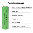 eatures. 1. Leak-proof technology, strong sealing, protection of electrical appliances. 2. High and low temperature resistance, stable voltage and current output. 3. Mercury free, environmental friendly, no harmful substances, safer to use. 4. This 3000mAh AA battery is a rechargeable battery. 5. The rechargeable battery has long service life and high efficiency. 6. Small and rechargeable, so you can carry it anywhere and anytime. 7. Suitable for keyless entry devices, garage door openers, car remote controls, remote keys, wireless doorbells, ceiling fans, GPS trackers, home alarm systems, security devices, igniters, LED torches, toys, clocks, razors, etc. Specifications. 1.Capacity: 3000mAh 2.Voltage: 1.5V 3. Charging type: AA, alkaline rechargeable battery 4. Up to 1000 charge cycles 5. Excellent high discharge performance 6. Precise replacement of standard AA batteries 7. Excellent performance in low temperature conditions 8. Size: 14*50mm/1.96in*0.55in 9.Colour: Green Package Included: 1*AA battery