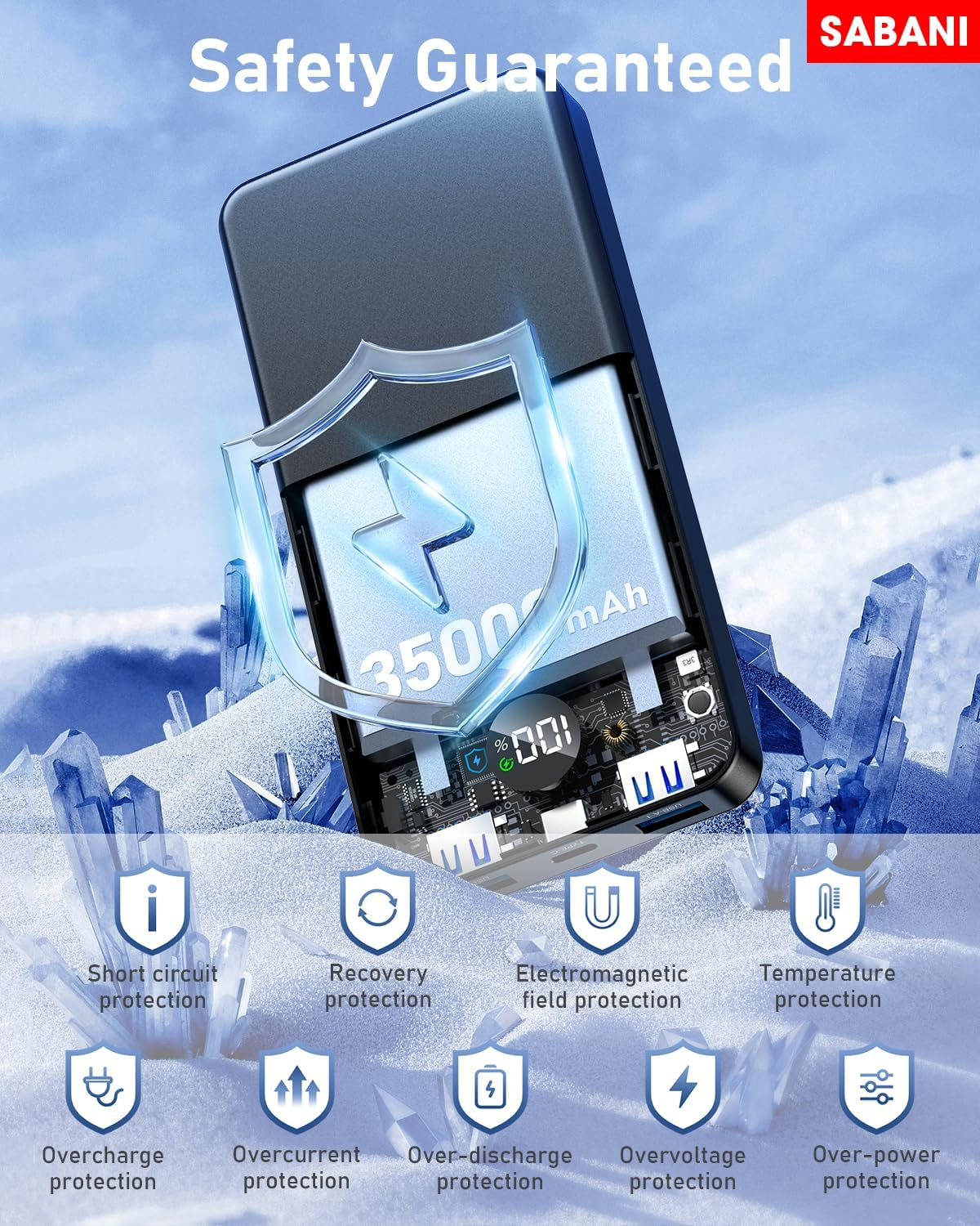 Store New Arrivals Add to Favorite View Feedback Contact Portable Charger 35000Mah Power Bank - Portable Battery with 4 Built in Cables Description Item model number N6 Whats in the box 1*Type C Charging Cable (for charging power bank), 1* 3 Months Warranty, 1* User Manual, 1*Power Bank with Built-in Cables Battery Capacity 35000 Milliamp Hours Color A-Black Product Dimensions 5.95 x 2.87 x 0.79 inches Connector Type USB Type C, USB Type A Item Weight 11.3 ounces Batteries 1 Lithium Metal batteries required. (included) Special features Digital Display, Lightweight, Over Charging Protection, Built In Cable, Pocket Size Other display features Wireless Special Feature Digital Display, Lightweight, Over Charging Protection, Built In Cable, Pocket Size Brand SABANI Manufacturer Zhengzhou Mangrao Trading Co., LTD Widely Compatibility Power Bank with Built-in Cables: N6 USB C portable charger has 4 built-in cables (iOS, Type C, USB A, Micro) and 3 Charging ports (USB A 1/2, Type C), compatible with almost all types smart devices on market such as iPhone 16 15 14 13 12 11 Series, XR, XS Max, Samsung S24, S23, S22, S21, S20, A52, A32, Z fold series, Z flip series, and Google Pixel series, and other Android phones, iPad, tablets, etc... All in One Portable Charger: Portable powerbank has 6 outputs and 2 inputs, you may charge 6 devices max at the same time and recharge battery pack easily with 2 options (USB A cable, USB C port), which is great for multi electronic devices users. The Upgrade USB C interface serves as both input and output, perfectly fit your new iPhone, iPad and all upcoming USB C devices. No longer need to carry a variety of cables on the road, say goodbye to the trouble of messy charging cables! 35,000mAh Huge Capacity with Remarkable Compact Design: Must the high-capacity charger be big and heavy? No, N6 subverts your imagination! Using the new high-density polymer battery, it has a larger capacity under the same volume. Our 35000mAh portable battery is 151*73*20mm (5.95*2.87*0.79in), and weighs 335g (11.8oz), close to the size of the iPhone 15. The super compact and portable design allows you to easily place it in your backpack, handbag, or pocket. Ideal for those who need quick and reliable charging on- the-go. 3X Faster 22.5W PD Fast Charging Output: The N6 portable battery supports 22.5W PD fast charging, allowing your iPhone 15 to fully charge 50% in 30 minutes, nearly 3x faster than other traditional chargers, greatly reducing your charging time. Minimalist and elegant LED digital screen displays the battery power even accurately to 1%. Provide you with stable and reliable charging service anytime and anywhere, never have to worry about your phone dying again! Safe and Reliable Battery Pack: SABANI portable battery has 10 layers of multiple system protection, built-in low-temperature IC ice core, intelligent monitoring of voltage and current, actively avoid over-charge, over-discharge, short circuit, high temperature and a series of potential dangers, creating a safe charging environment for you. What You Get: 1*35000mAh Portable Charger with 4 built-in Cables and 3 Ports, 1*USB C Cable for Recharging Portable Charger, 1*User Manual. Product Description SABANI Portable Charger 35000mAh Power Bank with 4 Built-in Cables 35000mAh Huge Capacity + 4 Built in Cables + 6 outputs and 2 inputs + Fast and Efficient Charging + Accurate Percentage of Remaining Juice! ( IMPORTANT NOTICE : Due to big capacity, this power bank is NOT allowed on a plane.) Everything Built-in, No Need to Carry Extra Cords! Widely compatible with iPhone16 15 14 13 12 11 8 7 Series, XR, XS Max, Samsung S23 S22, S21, S20, A52, A32, Z fold series, Z flip series, and Google Pixel series, OnePlus series, Realme series, Oppo series, Xiaomi, Redmi, Vivo, LG, and other android USB C or Micro USB phones, tablets, etc... Charge Your Phone up to 50% in 30 Mins With the upgraded 22.5W output plus the latest PD 3.0 fast-charge technology, your phone can be charged at 50% in just 30 minutes. Built-in 4 cables, 2 USB A ports and 1 USB C port for charging up to 6 devices simultaneously. (USB-A built-in cable is for recharging itself only.) Built-in Multiple Cables and Ports Warm Tips: 1.When using it for the first time, please recharge the power bank to full uninterruptedly after the remaining power is depleted to reactivate the display. 2.Please clean the built-in cable's tip regularly to prevent bad contact due to stains or oxidation reactions. USB C in & Out Power Bank Please notice: The input port and input USB-A built-in cable may not be used at the same time. The USB-A built-in cable has no output function. Portable Charger for Multiple Devices Warm Tips: If the low-current device (earbuds, smartwatches, etc.) is about to be fully charged (the power is above 85%), its input current will become 30-40mA, while the output current of the power bank is at least 60mA, so the power bank will automatically power off. Travel Essentials Using the new high-density polymer battery, it has a larger capacity under the same volume. Let you get rid of the anxiety about the battery level of your mobile device anytime, anywhere! Whats in the box? 1*Power Bank with Built-in Cables; 1*Type C Charging Cable (for charging power bank); 1* User Manual ABOUT US We offer the best prices around on high quality products. Our E-store includes media such as books, movies, music and games while offering electronics, toys, sporting apparel, clothing, tools, general home, garden items and more. SHIPPING We are always working hard to ensure your package arrives as soon as possible. Please understand that some factors like weather, high postal traffic, and the performance of shipping companies are outside of our control. We offer free shipping to the lower 48 states and ship within 2 business days of payment, usually sooner. We do not accept P.O. Boxes. Please provide a physical address. RETURNS We offer a 30-Day Return Policy on items which you are
