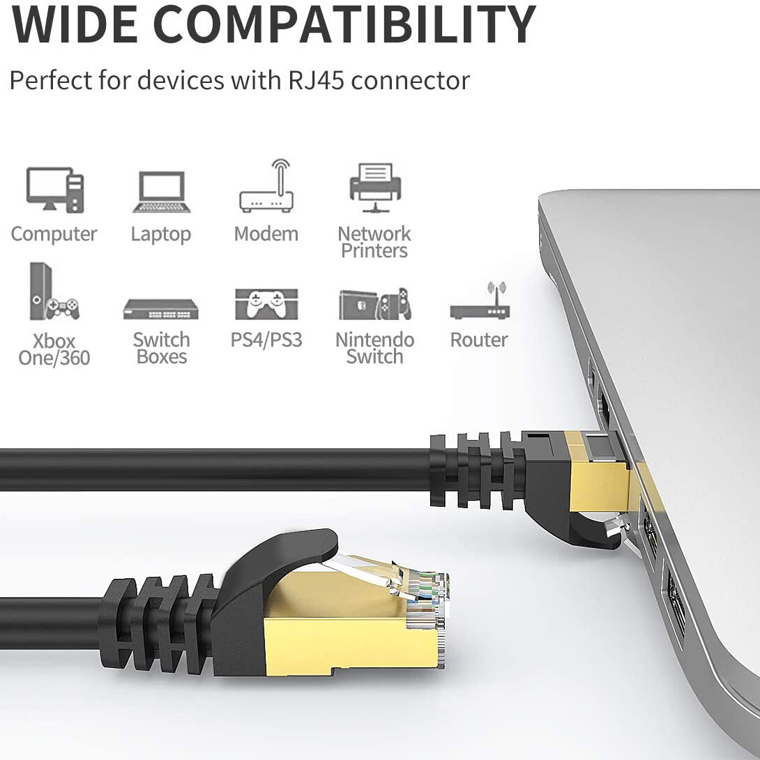 S UPPLY D IFFERENCE T O Y OU No fake order-records, No fake feedbacks. All sales and feedbacks are guaranteed real. All sources for our customers only. Focus on best products and services. Cat 8 High-Speed S/FTP Ethernet Lan Cable Soft Jacket 26AWG Perfect for LAN network components such as PCs, computer servers, printers, routers, switch boxes, network media players, NAS, VoIP phones, PoE devices, and more High Speed Cat 8 High-Speed S/FTP Ethernet Lan Cable Soft Jacket 26AWG Often copied but never equaled, Our Professional Electronic Essentials are now better than ever. Cat 8 High-Speed S/FTP Ethernet Lan Cable , built using only premium materials and the most advanced technology. Gold Plated RJ45 Connector Premium High Speed FLEXIBLE & DURABLE UNIVERSAL COMPATIBILITY 40Gbps 2000Mhz Packing Include 1*Cat 8 High-Speed S/FTP Ethernet Lan Cable Soft Jacket 26AWG Sport Essentials Our acclaimed series of Electronic Essentials. Built using only high-grade materials and exclusive technology. From US to US The item(s) in this listing can be only shipped to US Territory. Item Details Description The Yellow-Price CAT 8 Ethernet cable : support bandwidth up to 2000MHZ and 40Gbps data transmitting speed, so you can connect to your LAN/WAN segments and networking gear at maximum speeds and surf the net, stream videos, music and other data at high speed without worrying about cables causing a mess.The Cat 8 Cable additional shielding and improved quality in twisting of the wires provides better protection from crosstalk, noise, and interference that can degrade the signal quality, the network speed is more stable.This cable is your best choice. Cat 8 Ethernet cable Backward Compatible with Cat5, Cat5e, Cat6, Cat6a, Cat6e, Cat7, Cat7a cable standards. FLEXIBLE & DURABLE: The improved soft and environmental PVC provides a durable, strong cable jacket for abrasion and corrosion resistance, which is more effective to protect against EMI/RFI interference, water proof & UV Proof, extremely low signal attenuation for long distance transmission and high resistance to external interference. Durable enough for your everyday use. Cat8 cable has a maximum channel length of 20m (66ft). We make it rounded and 6.3mm diameter in order to comply with Cat8 26AWG standard completely.Comparing with other 32AWG ethernet cable,26AWG cable is thicker,faster and more stable.Therefore,cat8 cable is round not flat. Specifications : 1. Bandwidth: 2000Mhz 2. Supports: 40 Gbps 3. Conductor Guage: 4 Pairs 100% 26AWG pure copper 4. Connector Type: Gold Plated RJ45 5. Connector Type: Gold Plated RJ45 6. Construction: S/FTP (Shielded Foiled Twisted Pair) 7.Conductor Material: Oxygen-free Copper 8. Max Operating Voltage -UL: 30V 9. Application: Smart Home/Office, Server Applications, Cloud Computing, Data Centers, High Performance Computer Networking Application Features Guarantees All items which distrubuted and sold by us Quality Guaranteed Our premium materials and advanced technology prevent you from any quality issues. 100% Functional Test before shipment. Laboratory reliability test to simulate the whole designed life circle. Service Guaranteed Local US Company Located in Los Angeles and New York, Full Legal Responsibility. Lifetime technical support. 24 Hrs customer inquiry response guaranteed. On-Time Delivery Guaranteed Local US Distribution Center which located in Los Angeles and New York. Less than 1-Day order handle time, all orders are shipped out within 24 hrs. USPS© First Class with valide individual tracking number. Safe, fast and trackable. Satisfaction Guaranteed Beside Manufacturer Warranty, seller provide additional 6-Months warranty. 30-Days No-Reason-Return, absolutely FREE. Fullfil & Exceed all your expectations. On Nov 15, 2023 at 09:29:48 PST, seller added the following information: