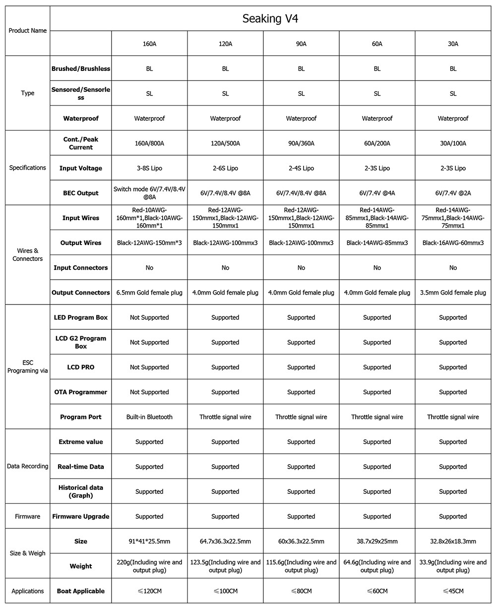 HOBBYWING Seaking Brushless ESC Boat Sensorless ESC 30A 60A 90A 120A 160A V4 Series IP67 Waterpoof Built-in BEC For RC Model Boats Features: 1. Ultra-high Reliability and Durability. 2. lP67 protection rating, this Esc boasts outstanding waterproof and dustproof capabilities. 3. The built-in BEC features a high output current and adjustable output voltage withtwo or three levels, 4. Slim Design,allowing for easier installation on narrow boats. 5. By connecting the ESC to the OTA Bluetooth module,Built-in Data Logging for Performance Monitoring. 6. The capacitor overheating protection helpsprevent damage to the ESC caused by capacitor failure due to overloading Description: Seaking 160A/120A/90A/60A/30A V4 Brushless ESC,The built-in BEC features a high output current and adjustable output voltage with two or three levels, significantly narrower than the previous SeaKing 30A/60A/120A V3 models,allowing for easier installation on narrow boats. 160A ESC Specifications: Item: 160A Brushless Sensorless ESC Waterproof: IP67 Cont./Peak Current: 160A/800A Input Voltage: 3-8S Lipo BEC Output: Switch mode 6V/7.4V/8.4V @8A Output Connectors: 6.5mm Gold female plug Size: 91*41*25.5mm Weigh: 220g(Including wire and output plug) Boat Applicable: ≤120CM 120A ESC Specifications: Item: 120A Brushless Sensorless ESC Waterproof: IP67 Cont./Peak Current: 120A/500A Input Voltage: 2-6S Lipo BEC Output: 6V/7.4V/8.4V @8A Output Connectors: 4.0mm Gold female plug Size: 64.7x36.3x22.5mm Weigh: 123.5g(Including wire and output plug) Boat Applicable: ≤100CM 90A ESC Specifications: Item: 90A Brushless Sensorless ESC Waterproof: IP67 Cont./Peak Current: 90A/360A Input Voltage: 2-4S Lipo BEC Output: 6V/7.4V/8.4V @8A Output Connectors: 4.0mm Gold female plug Size: 60x36.3x22.5mm Weigh: 115.6g(Including wire and output plug) Boat Applicable: ≤80CM 60A ESC Specifications: Item: 60A Brushless Sensorless ESC Waterproof: IP67 Cont./Peak Current: 60A/200A Input Voltage: 2-3S Lipo BEC Output: 6V/7.4V @4A Output Connectors: 4.0mm Gold female plug Size: 38.7x29x25mm Weigh: 64.6g(Including wire and output plug) Boat Applicable: ≤60CM 30A ESC Specifications: Item: 30A Brushless Sensorless ESC Waterproof: IP67 Cont./Peak Current: 30A/100A Input Voltage: 2-3S Lipo BEC Output: 6V/7.4V @2A Output Connectors: 3.5mm Gold female plug Size: 32.8x26x18.3mm Weigh: 33.9g(Including wire and output plug) Boat Applicable: ≤45CM Package contents: 1* 30A/60A/90A/120A/160A V4 ESC Note: Only the above package content, other products are not included. 1.Due to the difference between different monitors,the picture may not reflect the actual color of the item. We guarantee the style is the same as shown in the pictures. 2.Due to the manual measurement and different measurement methods, please allow 1-3mm deviation.Thanks! Before purchase: 1.All the goods are ready stock, we will arrange the shipment at once if we receive the order. 2.Please read the item description, if you have any question, do not hesitate to contact us. 3.No warranty,if you receive a defect item,please contact us at once with item picture. 4.Use the vouchers for more saving. After purchase: 1.If you are satisfied,please express your use feeling. 2.Please contact us before you are going to give us bad review. We are helpful and will solve the problems. If you receive a defect item,please contact us at once with item picture or video.