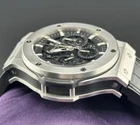 Hublot Aero Bang Big Bang 44 Steel Skeleton $17.2K MSRP 311.SX.1170.GR Condition is Pre-owned. Free shipping with FedEx Priority Overnight. Up for sale is this stunning Hublot Big Bang Aero Bang 44mm with box and Warranty Card dated 2016. It features a beautiful skeleton dial chronograph on the original black Hublot rubber strap. With an original MSRP of $17.2k it is great value at this price. This piece is in excellent condition It was kept in rotation among other high-end luxury timepieces, and cared for dearly. Keeps impeccable time, and perfect condition for a collector, investor, and enjoyer of haute horology. Please ignore any dust or lint in the photos. Also please note that scratches or traces of wear are enlarged in these images and, unlike when viewed in daylight, are more clearly highlighted. Location - Long Island, NY Includes - Inner and outer Boxes and Hublot Warranty Card. Shipping Method - Shipping is on us, Fully insured via FedEx with signature. I have plenty of references on the watch forums, enthusiast groups, - where I have done multiple seamless deals with total satisfaction! If you have any specific questions about the timepiece please feel free to reach out. Happy to offer references to serious buyers and answer any questions. Looking forward to hearing from you! I deal with absolute transparency and welcome any communication regarding the watch. I am an avid timepiece collector with references. -DragonsPrideVIP