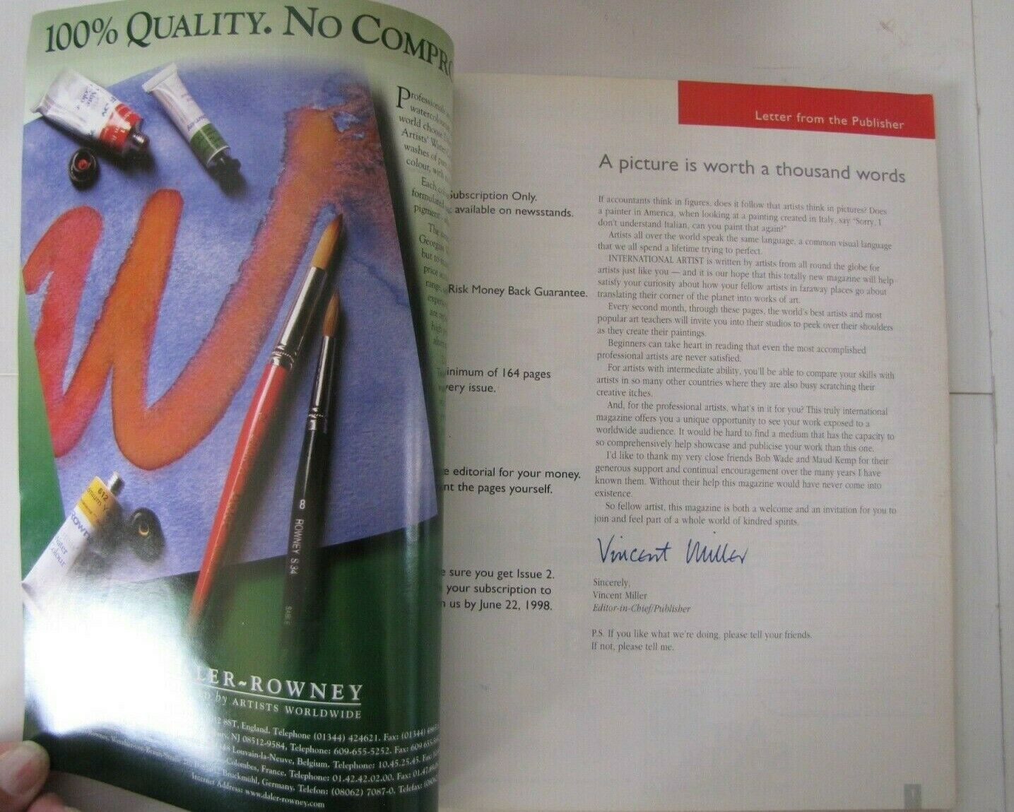 Up for auction is the art magazine "International Artist" June/July 1998 160 pages. I'd call it brand new because I've had it since 1998 and never read it. It came in the mail in the same condition as I have it now including the tiny nick on the bottom back cover. It features the best of the best artist's from around the world in all media. I subscribed to the magazine but didn't think it would make it because it was so much more expensive than other art magazines of the time and I just stored it away from any light, moisture and dust. So I'll call its condition like new but it really is brand new since it was never used in any way. Great collectors magazine since it's going to be around for a long time to come. It also includes the original subscription page and envelope. Payment is due within seven days of auction close. Thank for looking.