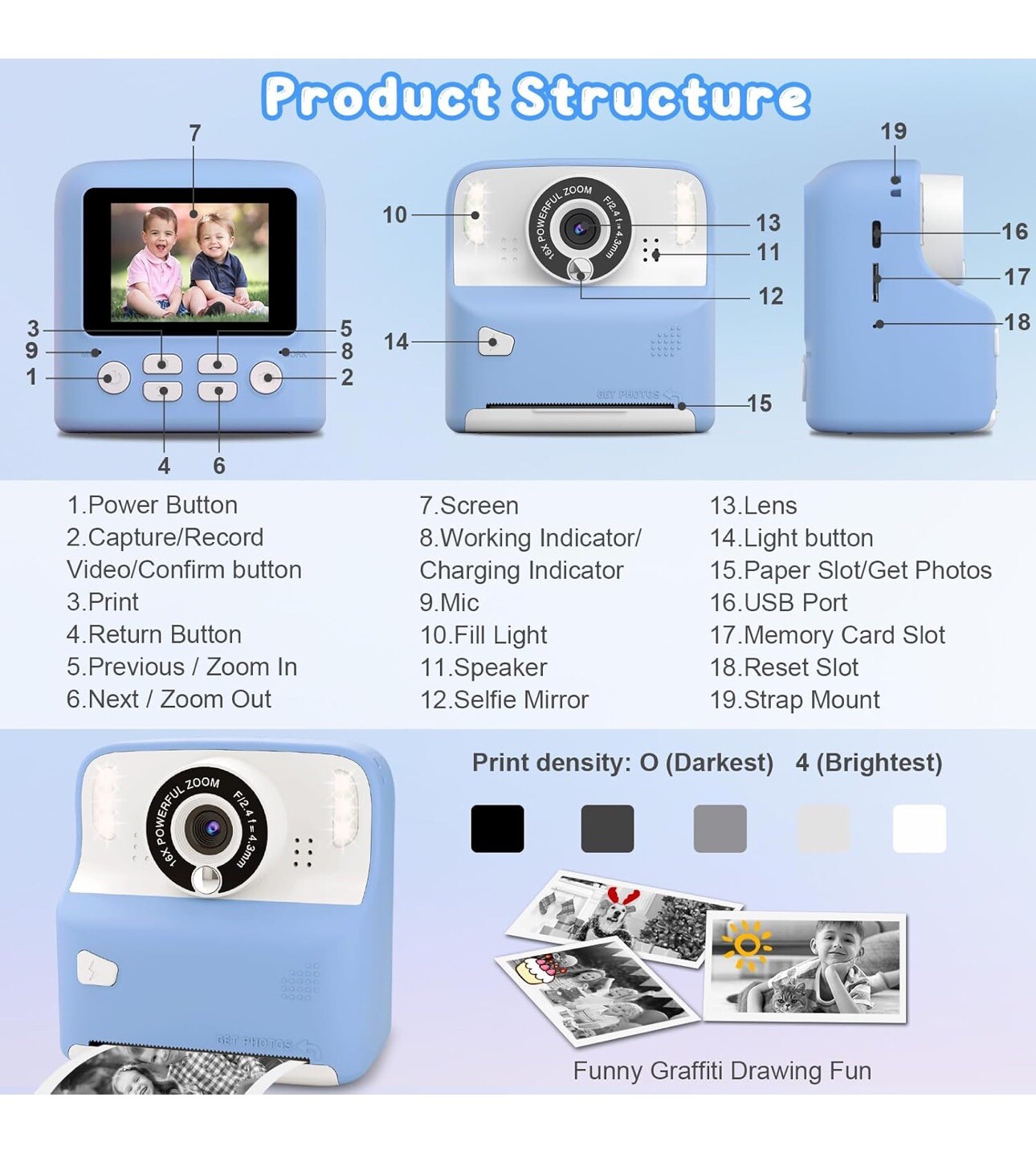 Brand new Multifunctional Camera with Instant Printing: This camera features a 2.4-inch screen, 1080p video recording, 15 filter frames, 16x digital zoom, flash, time-lapse, continuous shooting, games, selfie mirror, and MP3 playback. It also offers instant black and white photo printing, perfect for children's creativity Portable and Durable Design: Compact and easy to carry, this camera comes with 3 rolls of printing paper, allowing kids to draw on their photos. It also includes a 32GB SD card, Type-C cable for transferring files, and a lanyard. The battery lasts 2-3 hours for continuous use